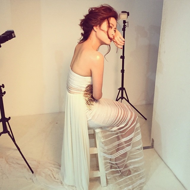 | Hoàng Thùy Linh có buổi chụp ảnh vào cuối tháng 5. Người đẹp diện đầm dạ hội voan trắng của Lê Thanh Hòa thể hiện hình tượng quyến rũ, kiêu sa. |