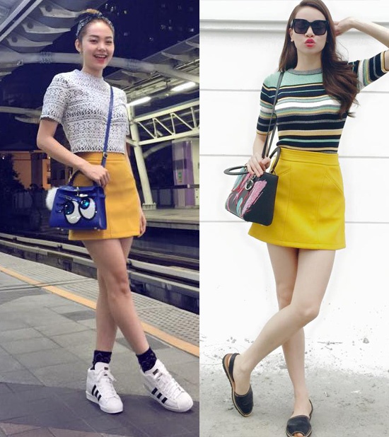 Mốt váy chữ A được lòng nhiều tín đồ thời trang trong tháng 5, Hồ Ngọc Hà và Minh Hằng không nằm ngoài vòng xu hướng. Hai người đẹp cùng diện mẫu váy chất liệu dạ, tông vàng của Zara khi xuống phố.