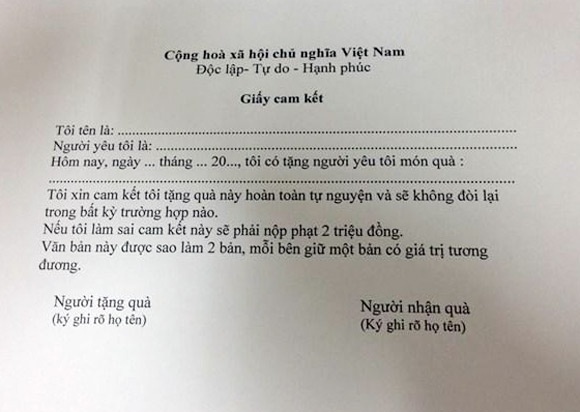 | Trên Facebook, một mẫu giấy cam kết với nội dung cam kết sẽ không đòi lại quà khi chia tay với đầy đủ chữ ký đang khiến cộng đồng mạng xôn xao. |