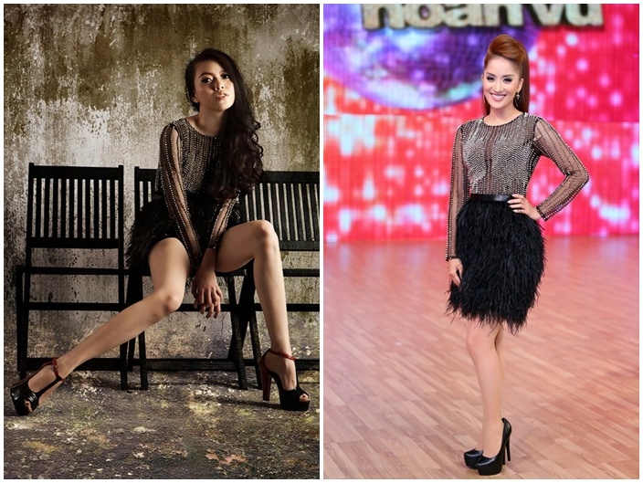 Trước Trúc Diễm, siêu mẫu Thanh Hằng từng mặc kiểu áo giống như đúc khi đảm nhận vai trò ban giám khảo cuộc thi tìm kiếm tài năng thiết kế trẻ. Cùng một kiểu áo nhưng với cách mix trang phục, kiểu tóc khác nhau đã tạo nên những hình ảnh sáng tạo, mới mẻ cho cả hai người đẹp.