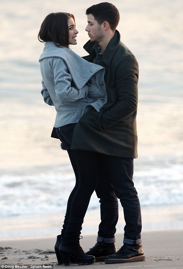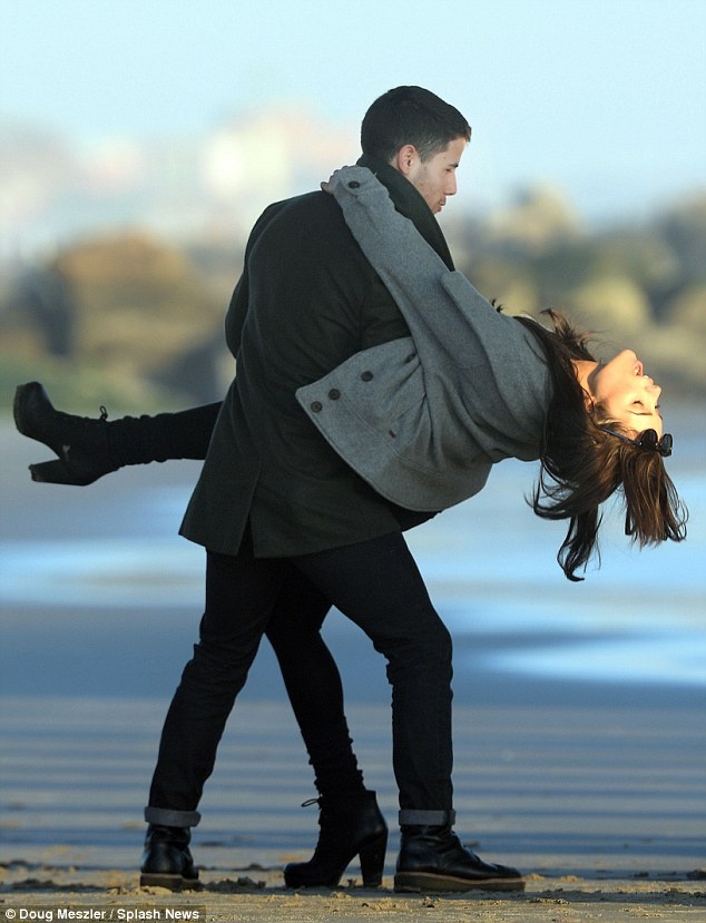 | Nick bế bổng người yêu đi dạo trên bờ biển. Cặp đôi bị bắt gặp hẹn hò vào tháng 6 vừa qua, cả hai quen nhau từ cuộc thi Hoa hậu Hoàn vũ Mỹ năm 2013 khi Nick là người giới thiệu trong chương trình. Có tin đồn nam ca sĩ sẽ cầu hôn người đẹp vào dịp Giáng sinh này. |