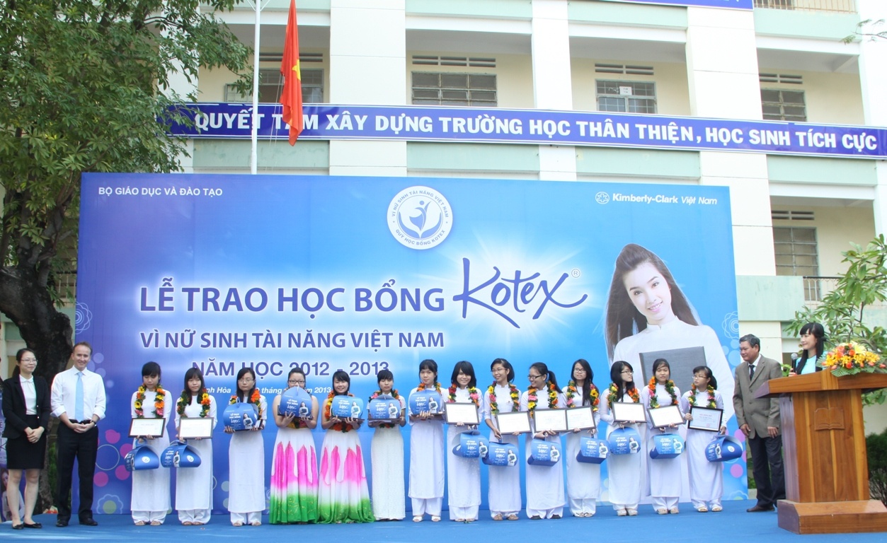 Xuất phát từ niềm tin rằng khi được khích lệ và chắp cánh đúng lúc, bạn nữ sinh dù có ở trong hoàn cảnh khó khăn đến đâu cũng sẽ đạt được những thành công nổi bật trong tương lai, Kimberly Clark Việt Nam đã phối hợp cùng Bộ GD&ĐT thành lập quỹ học bổng Kotex - Vì nữ sinh tài năng Việt Nam từ năm 2002. Tiếp nối hành trình 10 năm qua, năm nay chương trình trao học bổng của quỹ Kotex - Vì nữ sinh Tài năng Việt Nam 2012 - 2013 sẽ tiếp tục đến với 300 bạn nữ sinh tại 20 tỉnh thành khác trên khắp cả nước.