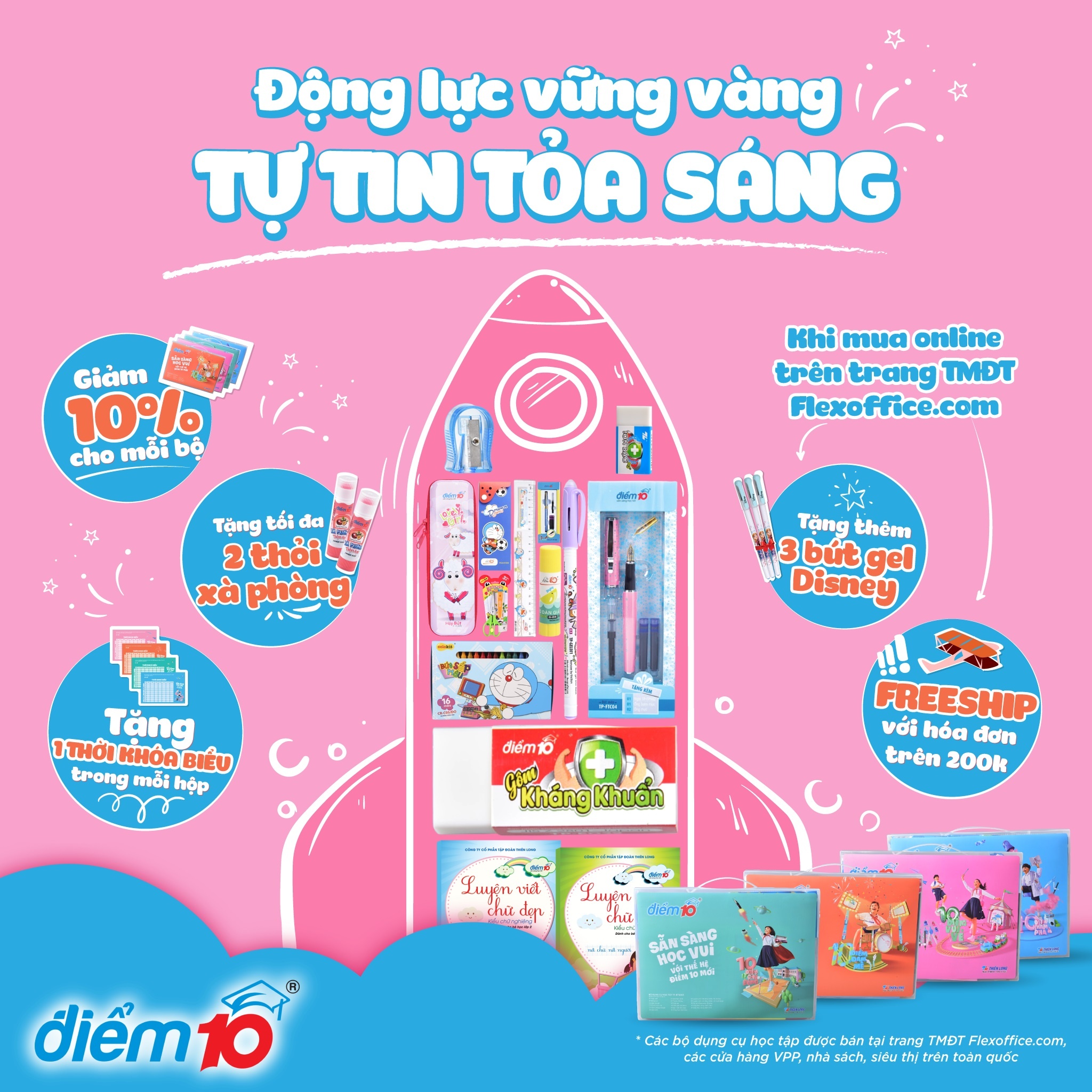 Mừng dịp tựu trường, Điểm 10 áp dụng chương trình khuyến mại hấp dẫn trên toàn quốc: Giảm giá 10% và tặng kèm tối đa 2 thỏi xà phòng tiện lợi, giúp bé an tâm đến trường và khám phá điều hay. Khi mua sản phẩm trên trang thương mại điện tử flexoffice.com, ngoài xà phòng tiện lợi, mẹ và bé còn được tặng thêm 3 cây bút gel Disney, các bộ lớp 2, 3, 4-5 có giá trên 200.000 đồng sẽ được miễn phí vận chuyển. Số lượng quà tặng có hạn, mẹ có thể đến các cửa hàng, nhà sách trên toàn quốc đến lựa chọn bộ đồ dùng học tập Điểm 10 cho bé, hoặc mua trực tuyến tại đây.