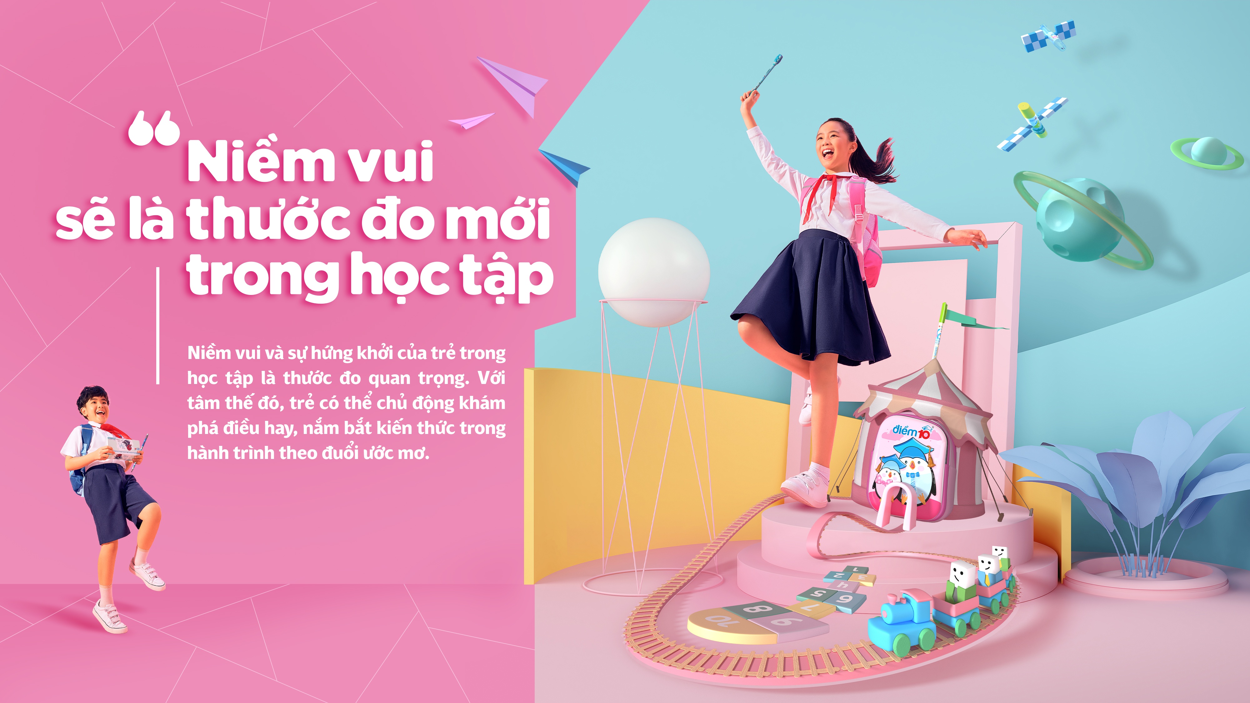 Thấu hiểu những thay đổi đó, năm học này, Điểm 10 - nhãn hàng dụng cụ học tập thuộc Tập đoàn Thiên Long - đã chuyển từ thông điệp “Cùng vui tựu trường - sẵn sàng học tốt” trước đó sang “Sẵn sàng học vui với Thế hệ điểm 10 mới”, phù hợp hơn với tư duy giáo dục mới.