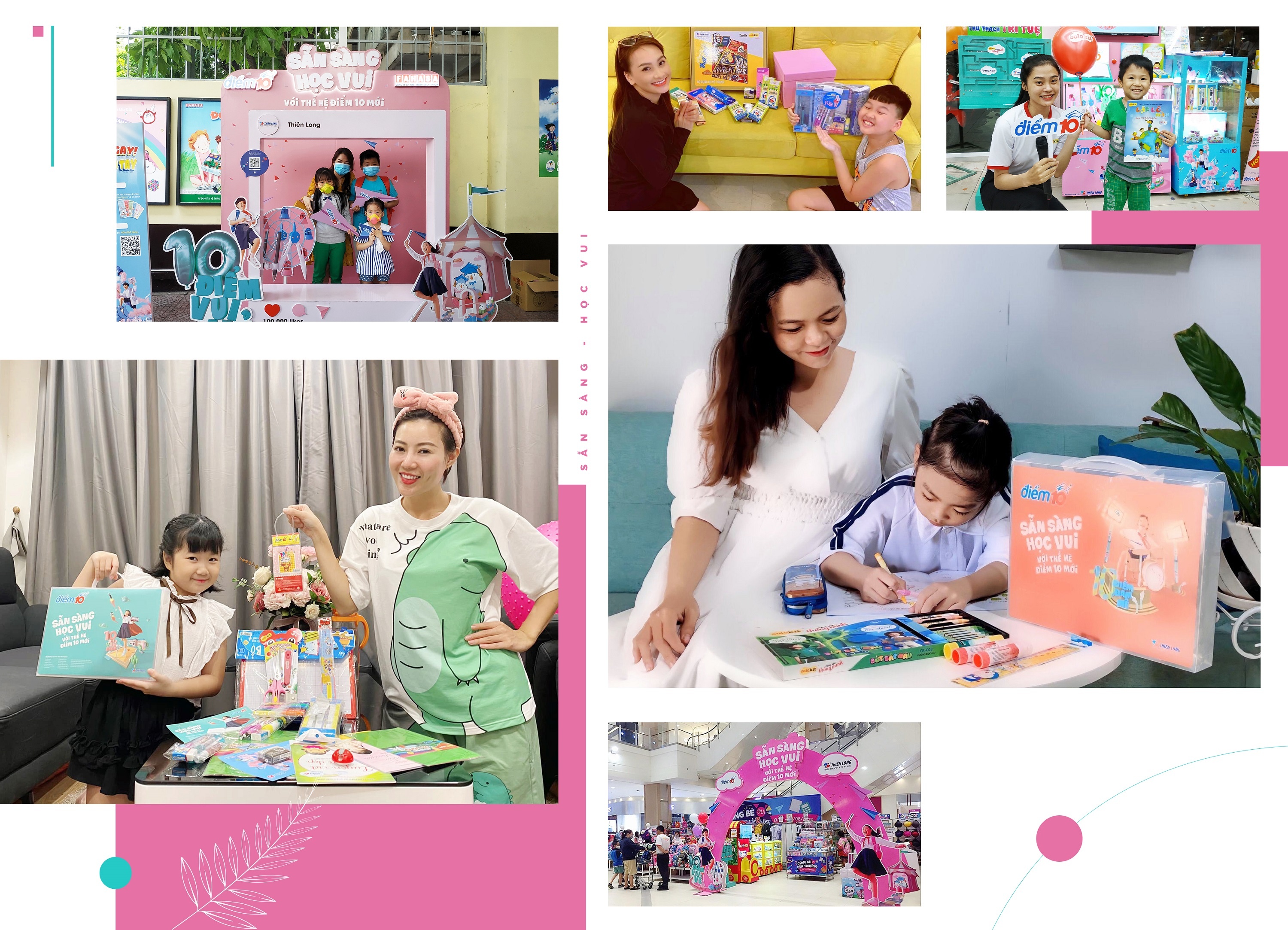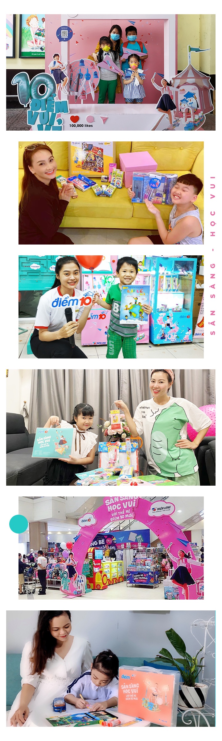 Ngoài bộ sản phẩm học tập làm bạn đồng hành cho hành trình đến trường của bé thêm vui vẻ, nhãn Điểm 10 còn tổ chức nhiều hoạt động thú vị cho mẹ và bé đón năm học mới, như chuỗi hoạt động chụp ảnh, check-in nhận quà tại các nhà sách lớn, hay chương trình hoạt náo Hành trình tri thức 2020, hướng dẫn trẻ tham gia những thử thách trí tuệ... Với phong cách vui tươi, sôi động, các sự kiện đã đã thu hút được sự quan tâm của nhiều phụ huynh và học sinh, truyền tải thông điệp về một năm học mới tràn ngập niềm vui.