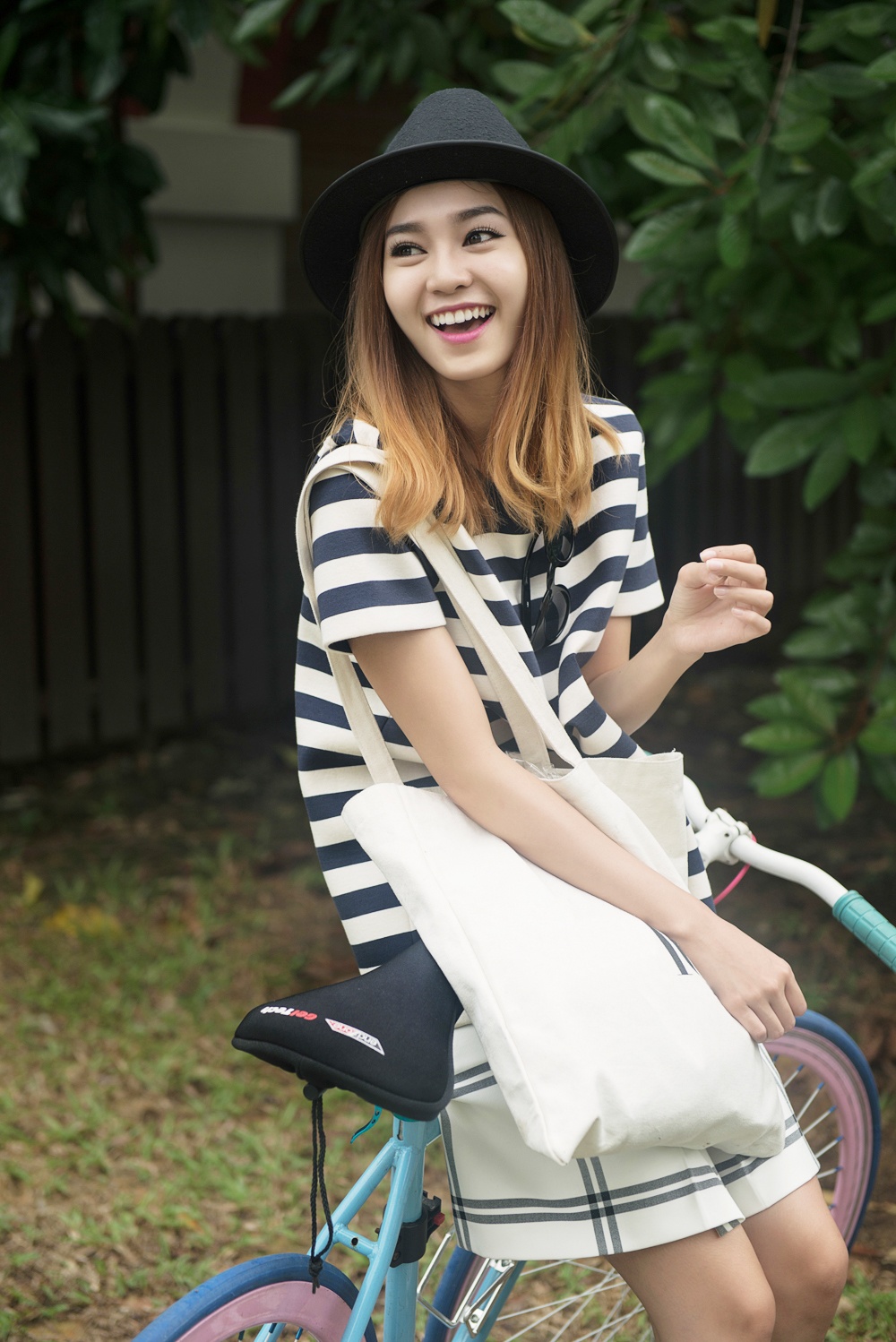 Nữ diễn viên tạo dáng tinh nghịch khi diện bộ đầm tối màu, họa tiết sọc kẻ gam xanh phá cách.