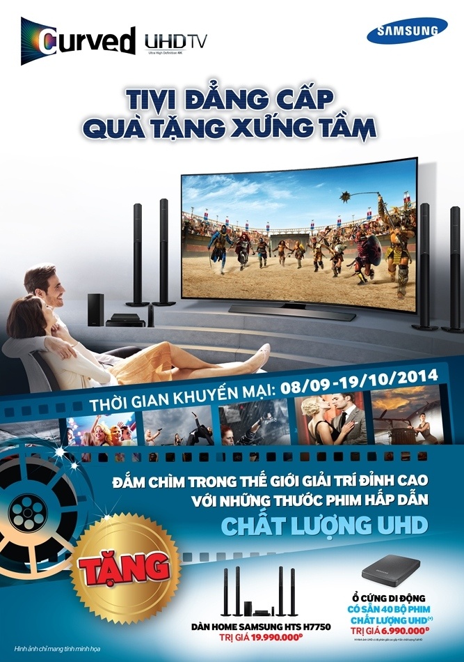 Đặc biệt, đối với 2 dòng sản phẩm cao cấp HU9000 78 inch và HU8500 85 inch, khách hàng đồng thời nhận được dàn giải trí tại gia Samsung HTS-H7750, trị giá 19,99 triệu đồng, nâng tổng giá trị quà tặng lên đến 26,98 triệu đồng. Dàn giải trí tại gia HTS-H7750 được trang bị công nghệ âm thanh vòm 7.1, 3D Blu-ray playback, khả năng nâng cấp âm thanh chuẩn 4K, kết nối không dây. Khi kết hợp với TV Samsung UHD màn hình cong, bộ đôi này sẽ mang đến những trải nghiệm nghe nhìn sống động và trọn vẹn hơn ngay trong phòng khách của bạn.