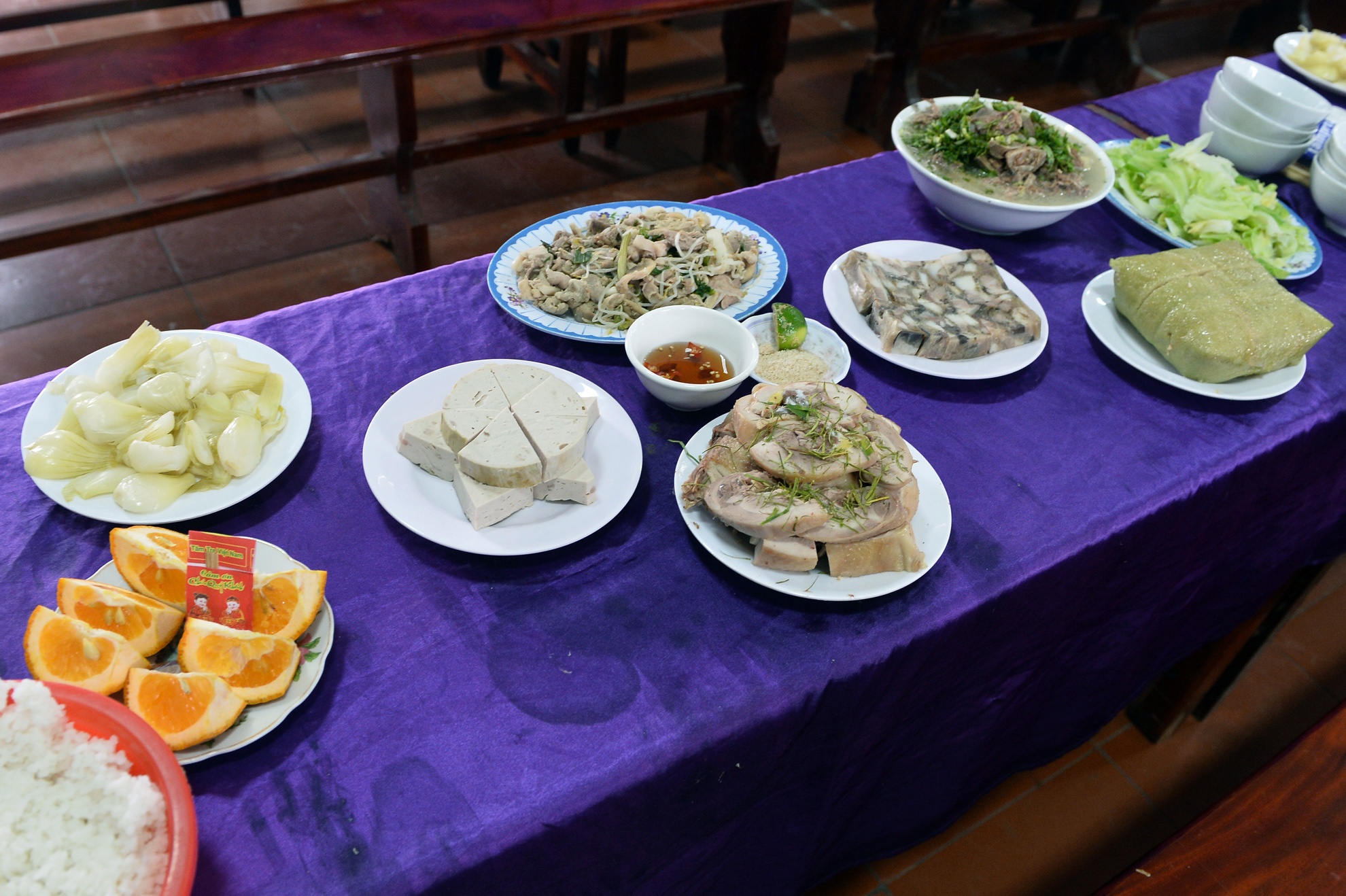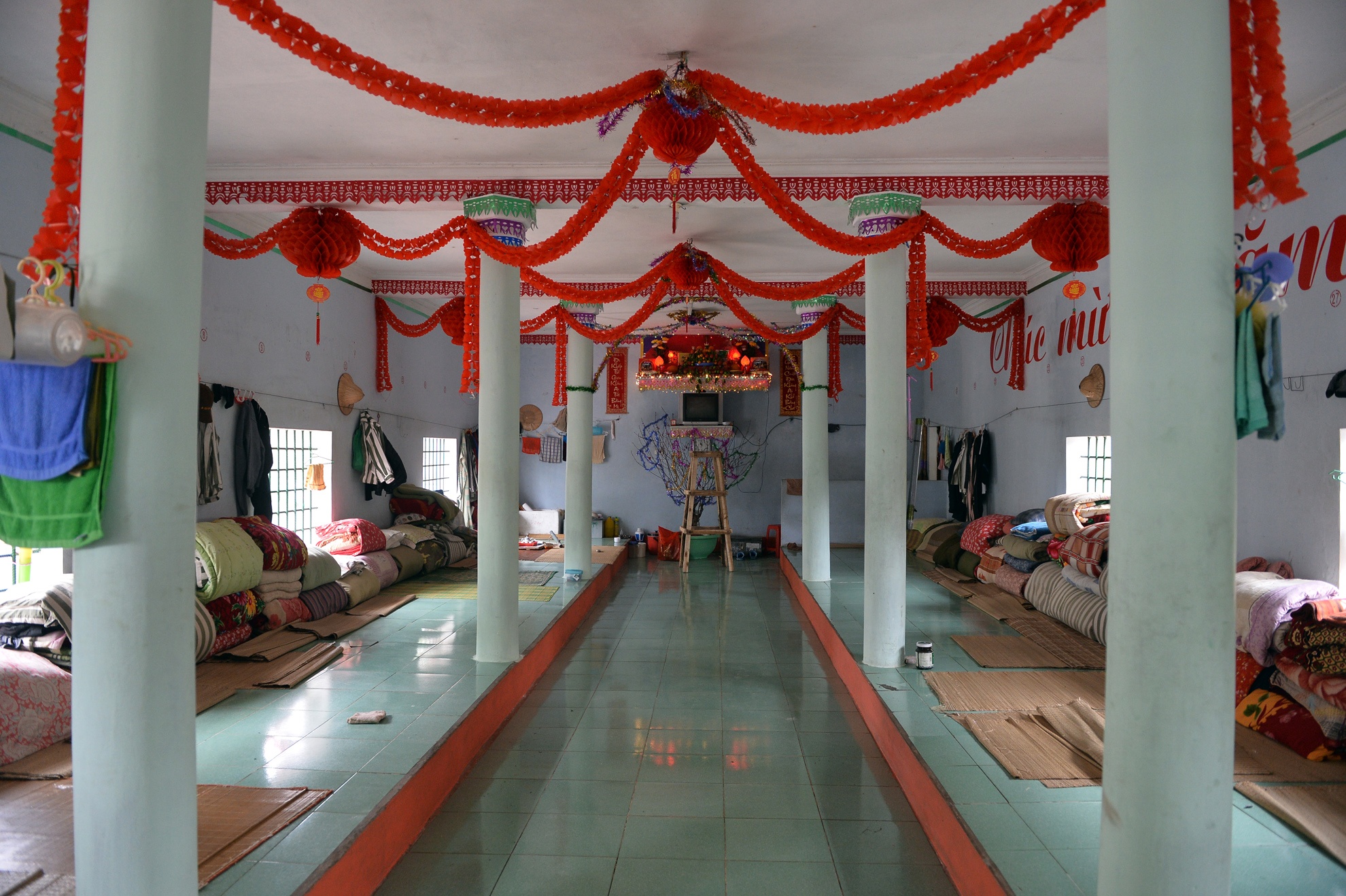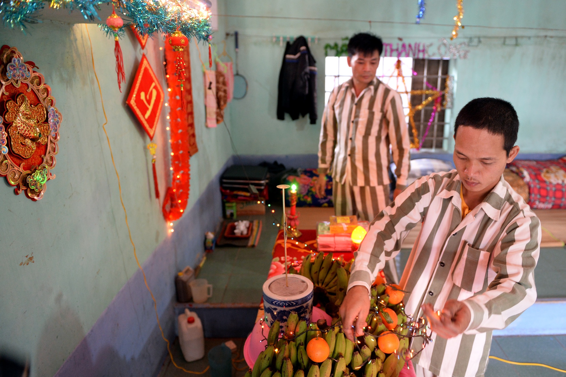 Các phạm nhân bày biện, sửa soạn ban thờ bên trong buồng giam.