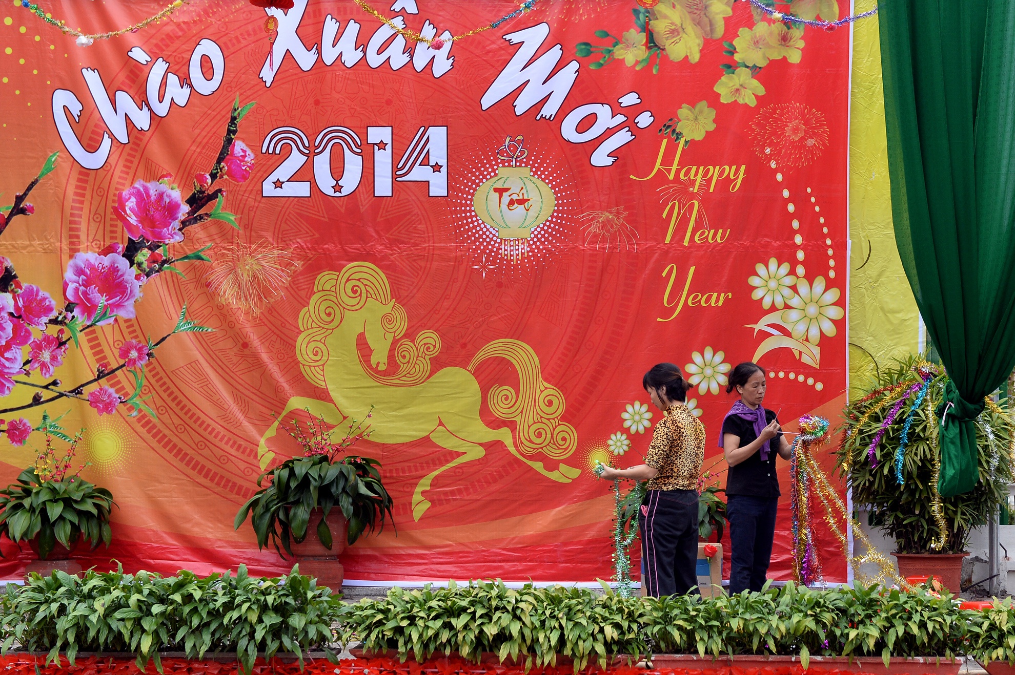 Ngoài cửa trang trí các câu đối, đèn lồng, hoa.