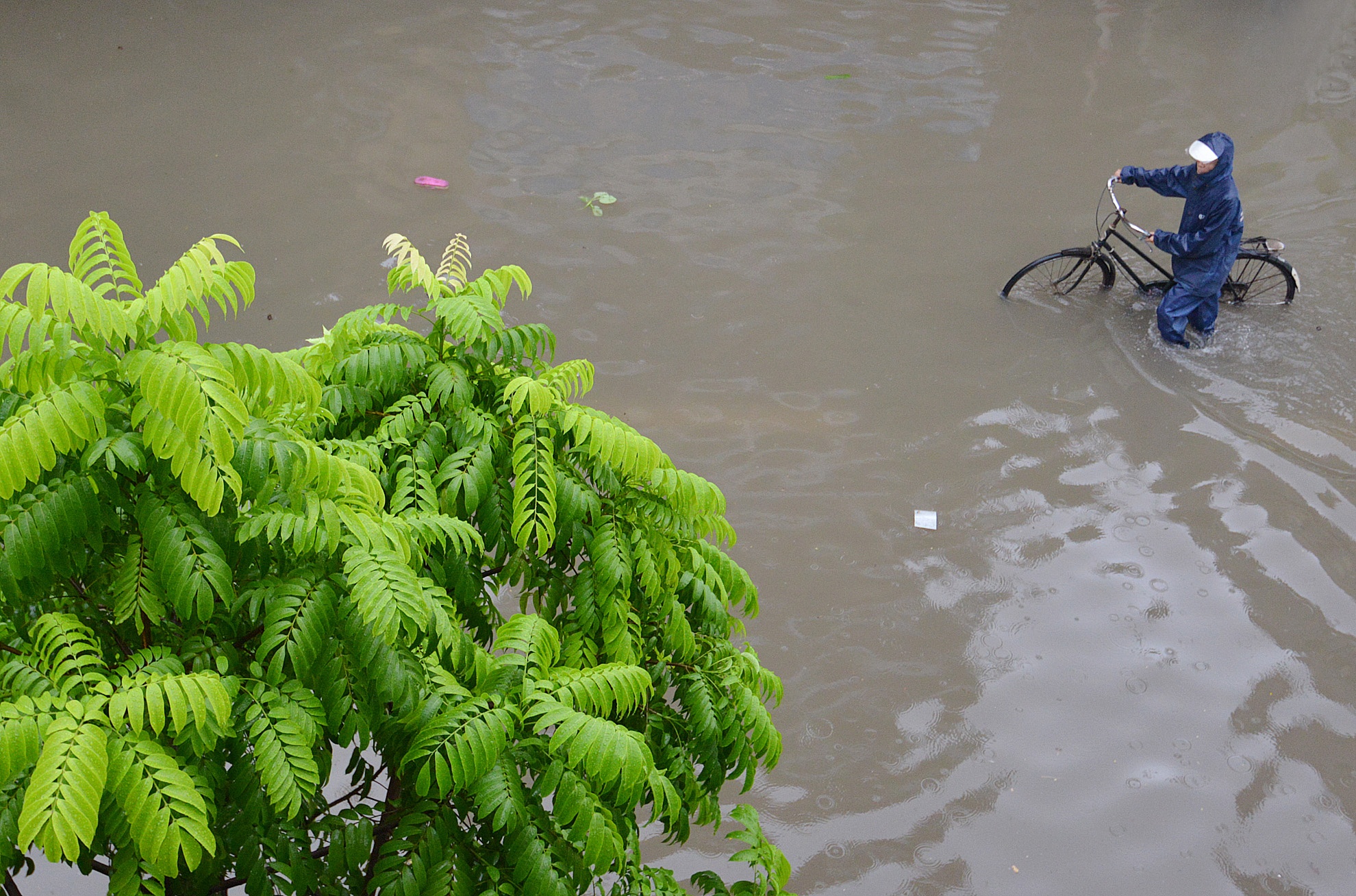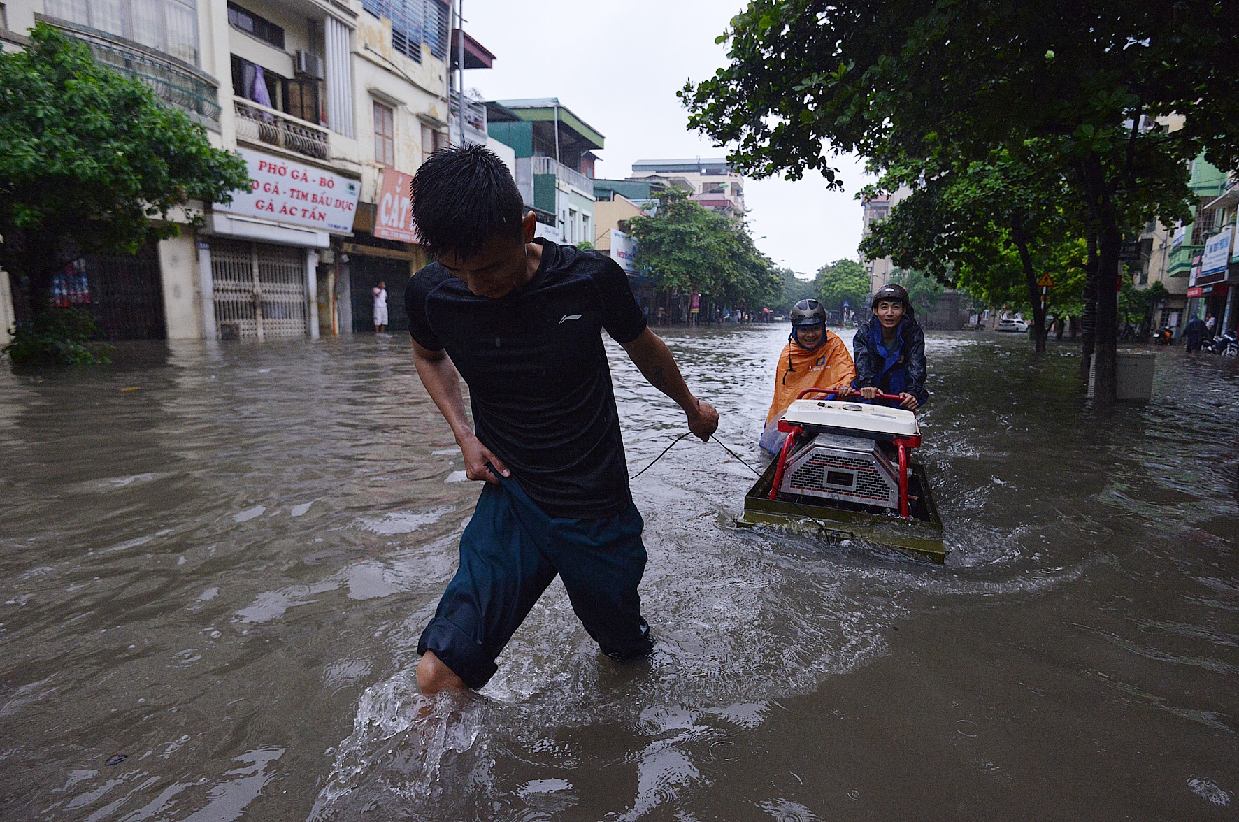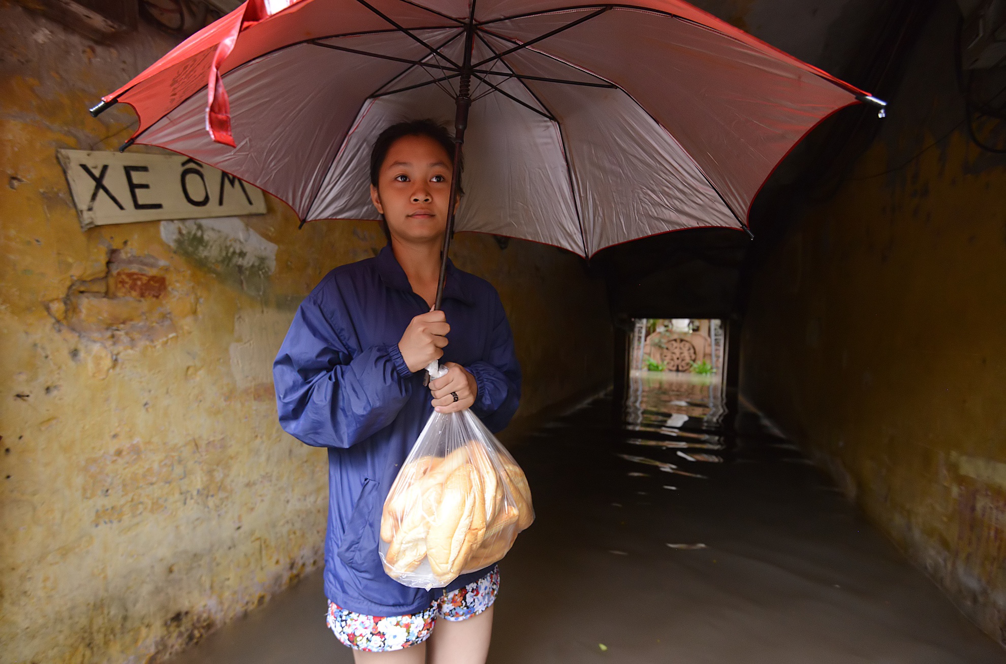 Cảnh ngập sâu 70 cm ở quận Long Biên Cơn mưa lớn rạng sáng 22/9 khiến người dân Hà Nội khổ sở chống chọi. Thực phẩm, đồ ăn được câu lên gác bằng dây chống đói do tất cả các cửa hàng, chợ đóng cửa nghỉ.