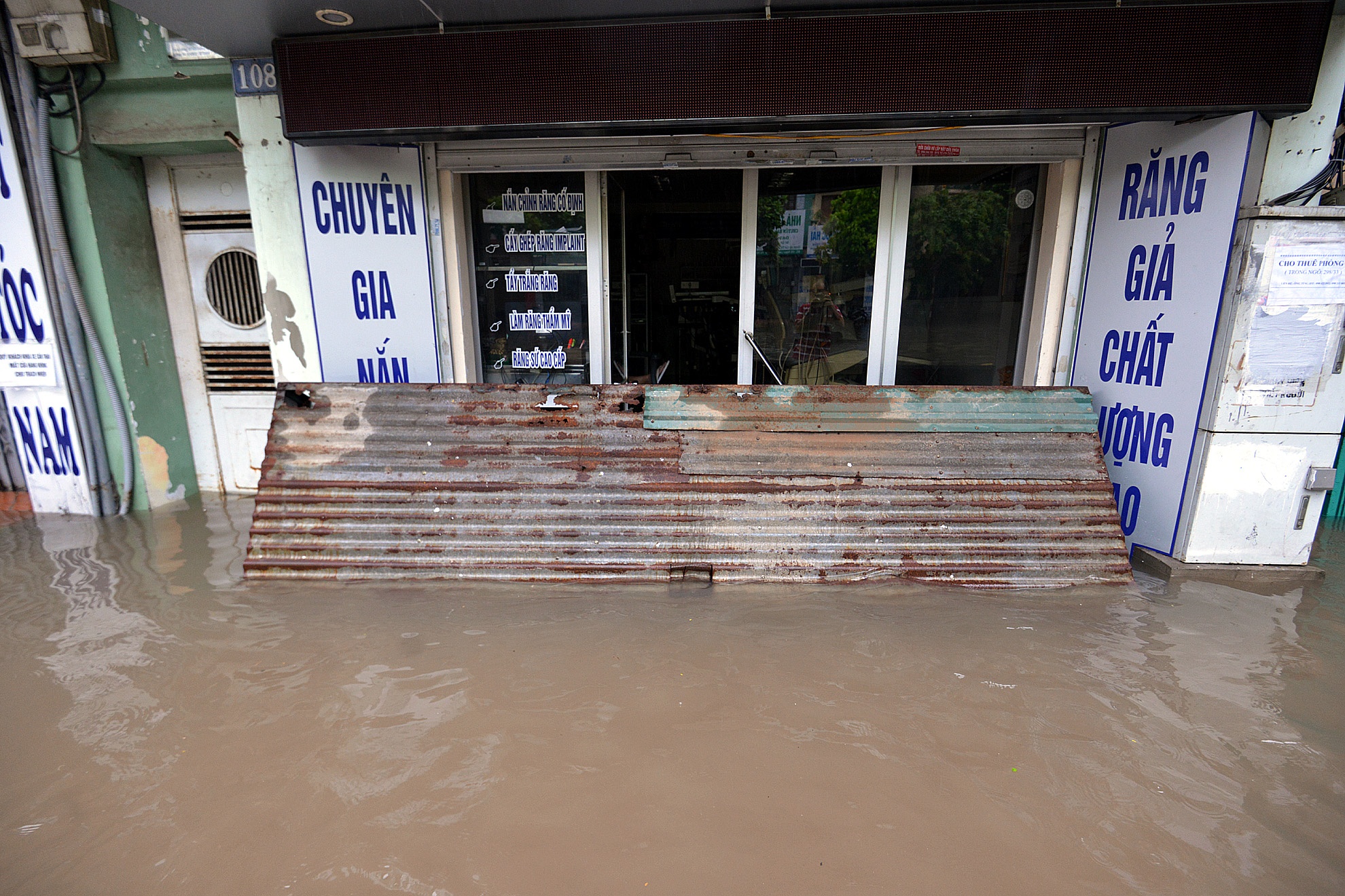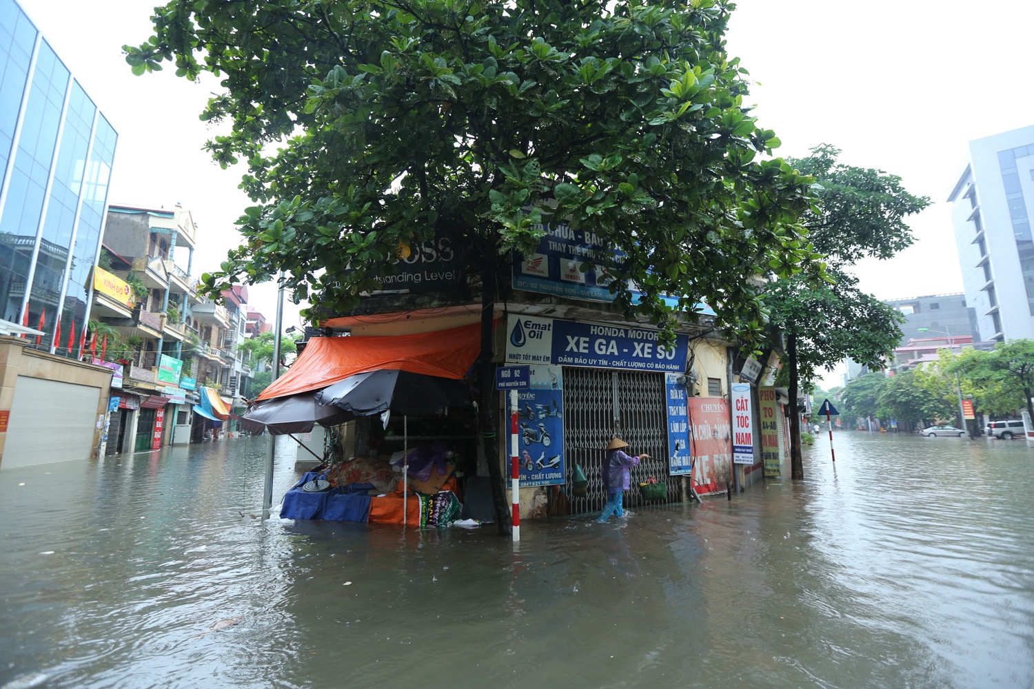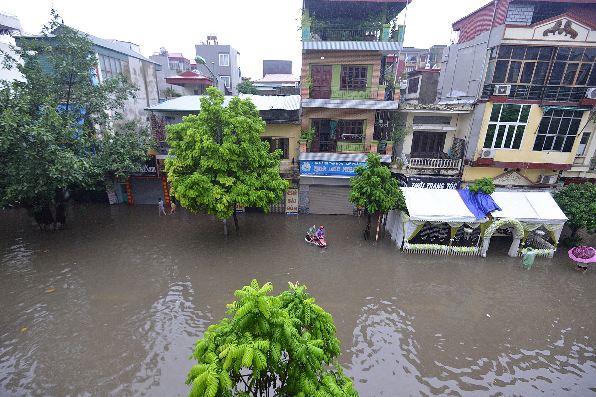 Sáng 22/9, tuyến phố Ngọc Lâm (quận Long Biên) dài gần 1 km chìm trong biển nước. Có nơi ngập sâu từ 50 - 70 cm. Ảnh: Vũ Minh Quân.