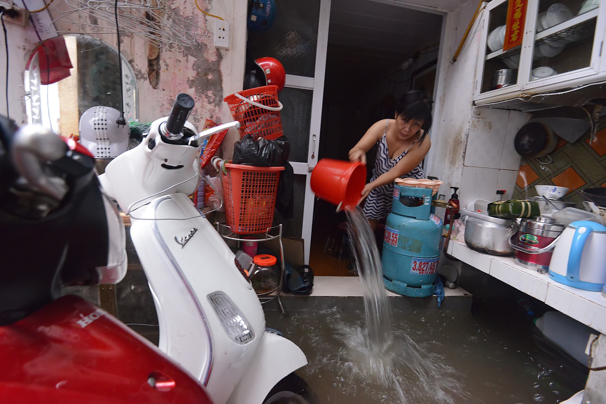 Trưa 22/9, chị Thảo (ngõ 142 Ngọc Lâm) tát nước ra khỏi nhà. Toàn bộ đồ đạc bát đĩa, bếp ga ngập trong nước.