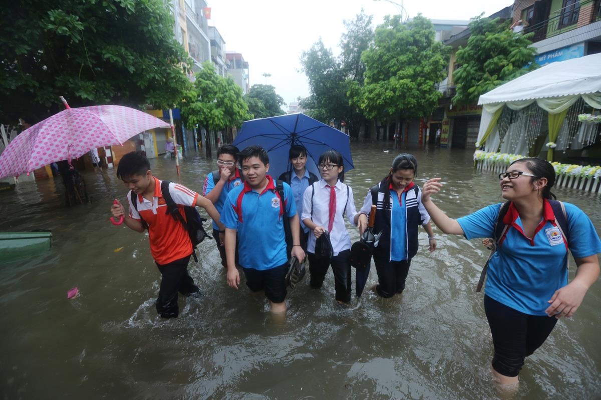 Đến trưa 22/9, sau khi mưa hơn 10 giờ đồng hồ, nhiều nơi ở Long Biên vẫn mênh mông như sông. Học sinh phải lội nước từ trường về nhà. Ảnh: Vũ Minh Quân.