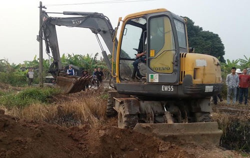 | Máy xúc được thuê đến để đào mộ ghi chôn chị Huyền. |