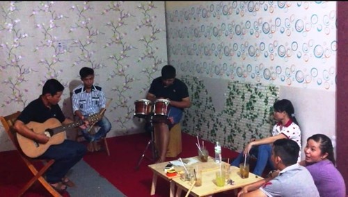 Thầy An cùng học trò đàn hát ngày họp mặt. Ảnh: Giáo Dục và Thời Đại. |