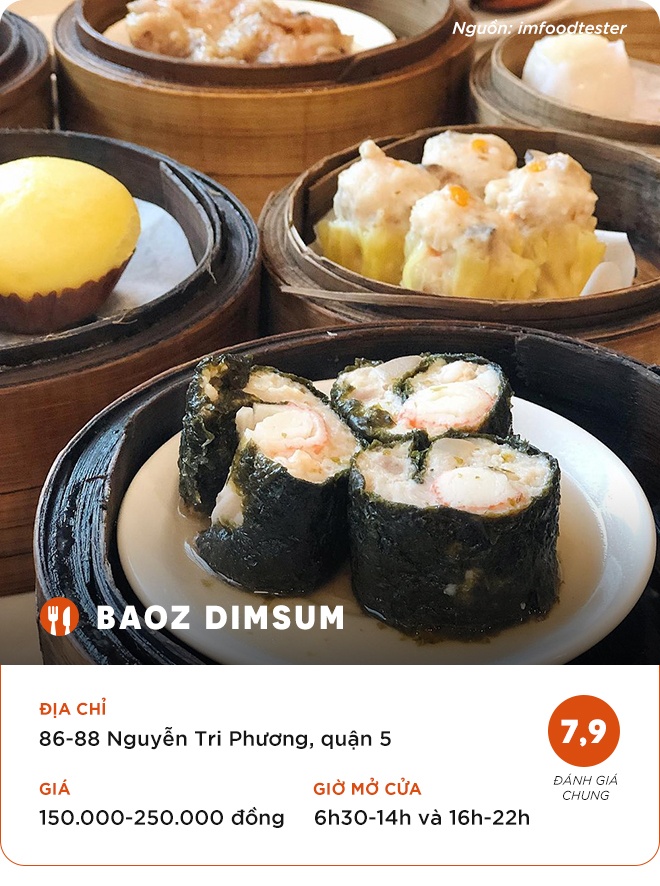 Nằm ở vị trí trung tâm quận 5, bạn có thể thưởng thức dimsum và các món ăn người Hoa tại cả 2 cơ sở của Baoz. Địa điểm này thường kín bàn vào buổi trưa. Thực khách nên đặt bàn trước khi tới dùng bữa. Thực đơn ở đây đa dạng với các món điểm tâm, bánh bao, bánh cuốn, hủ tiếu, mì, há cảo...