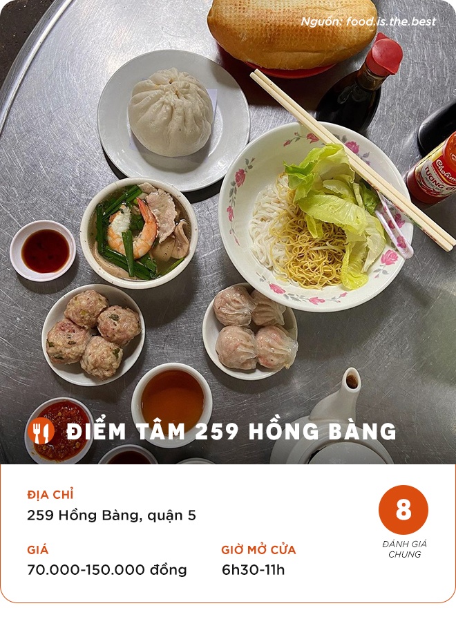 Nếu muốn thưởng thức các món điểm tâm chuẩn vị người Hoa với mức giá bình dân, bạn có thể lựa chọn quán ăn ở số 259 Hồng Bàng. Quán phục vụ các món dimsum và hủ tiếu, mì. Nhiều thực khách cho biết thực đơn ở đây không đa dạng nhưng các món được nêm nếm chuẩn vị Hoa.