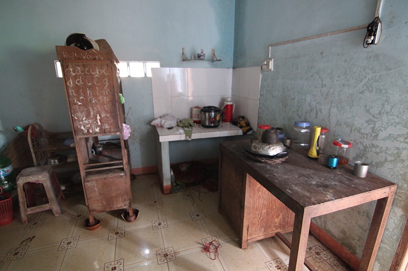 | Một góc nhỏ là bàn ăn. Cánh cửa tủ hỏng này là nơi em tập viết. |