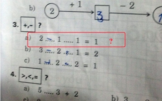 Chỉ là những đề toán lớp 1 nhưng đã khiến người lớn đau đầu, tạo nên những cuộc tranh luận gay gắt trên mạng xã hội. Chẳng hạn như một bài tập Toán lớp 1 yêu cầu học sinh điền dấu cộng trừ vào phép tính (2...1…1 = 1) để cho kết quả bằng 1. Nhưng rõ ràng không thể đặt dấu cộng và trừ vào phép toán này để cho ra được kết quả như vậy.