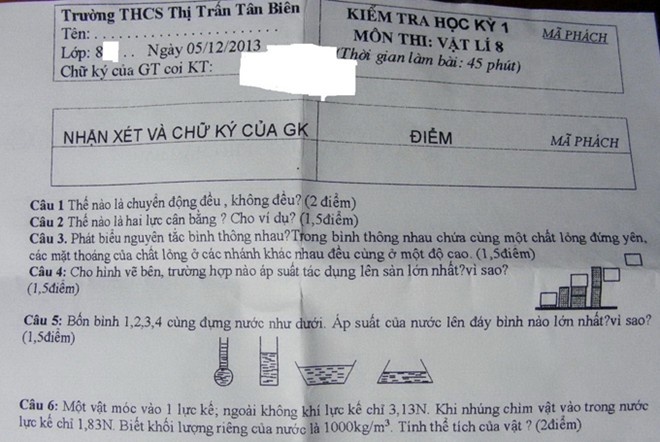 Đó là sự việc xảy ra tại kỳ thi học kỳ I môn Vật lý lớp 8 của trường THCS thị trấn Tân Biên (huyện Tân Biên, tỉnh Tây Ninh).