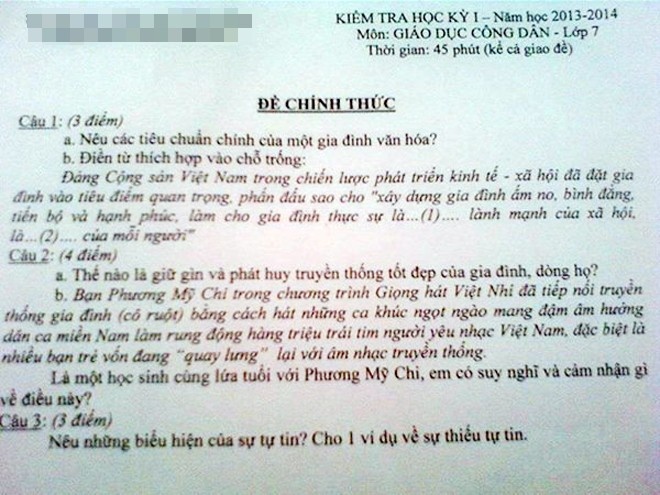 Vừa qua, trên mạng xã hội lan truyền bài kiểm tra học kỳ I môn Giáo dục công dân lớp 7 của một trường tại Đà Nẵng có câu hỏi liên quan đến… Phương Mỹ Chi - cô bé 11 tuổi đình đám của chương trình Giọng hát Việt nhí bởi giọng hát dân ca ngọt ngào.
