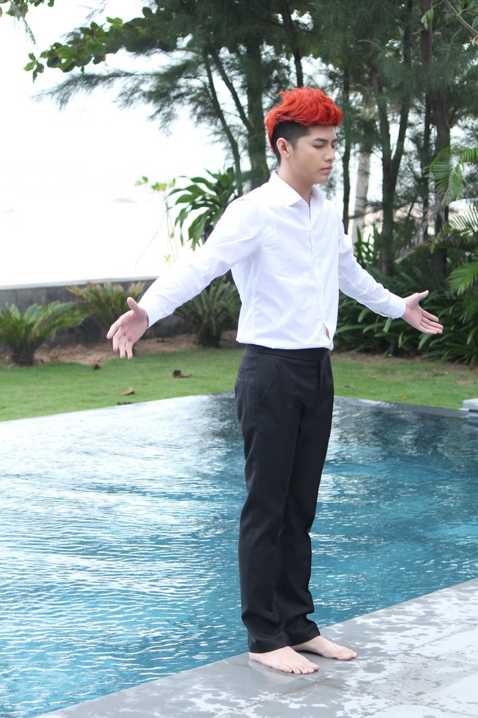 Trong khi Noo co ro vì ướt và lạnh, cô bạn diễn của anh là Helly Tống lại liên tục trêu đùa, giả vờ như muốn đạp anh chàng xuống hồ bơi.