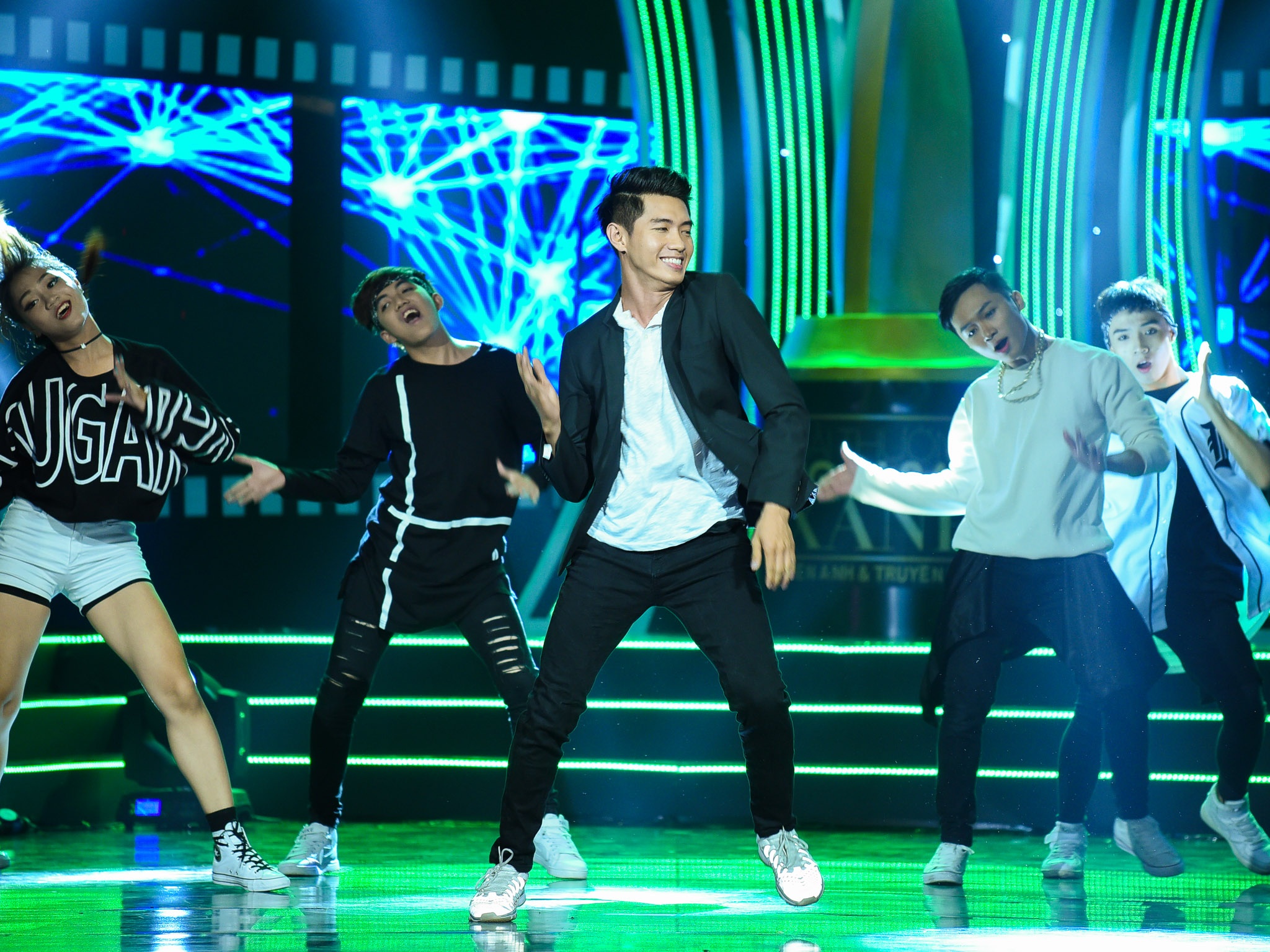 Quang Đăng và vũ đoàn khoe vũ đạo trong ca khúc nhạc phim Trùm cỏ. |