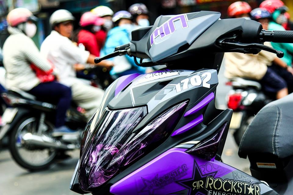 Chiếc scooter được sơn lại dàn vỏ kết hợp màu tím đen cùng họa tiết tem chìm Rockstar ít người chơi.