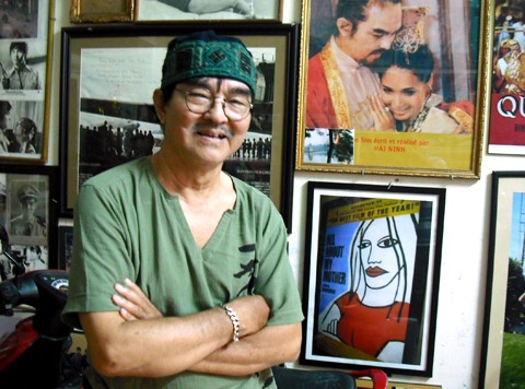 | Nghệ sĩ nhân dân Thế Anh bên hình ảnh bộ phim Đêm hội Long Trì nổi tiếng của ông. |