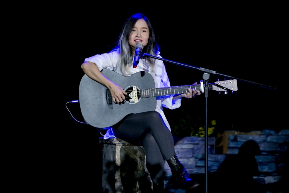 Mai Khôi gây ấn tượng với hình ảnh mạnh mẽ, cá tính, vừa đệm đàn guitar vừa hát Tàn phai . |