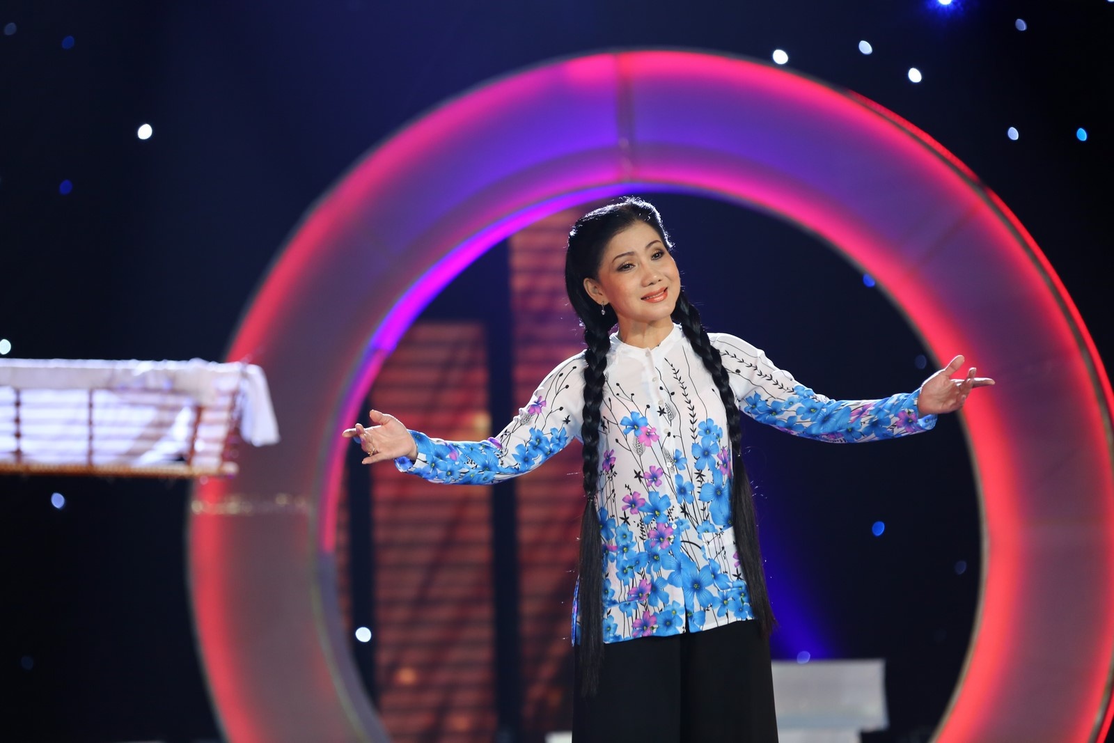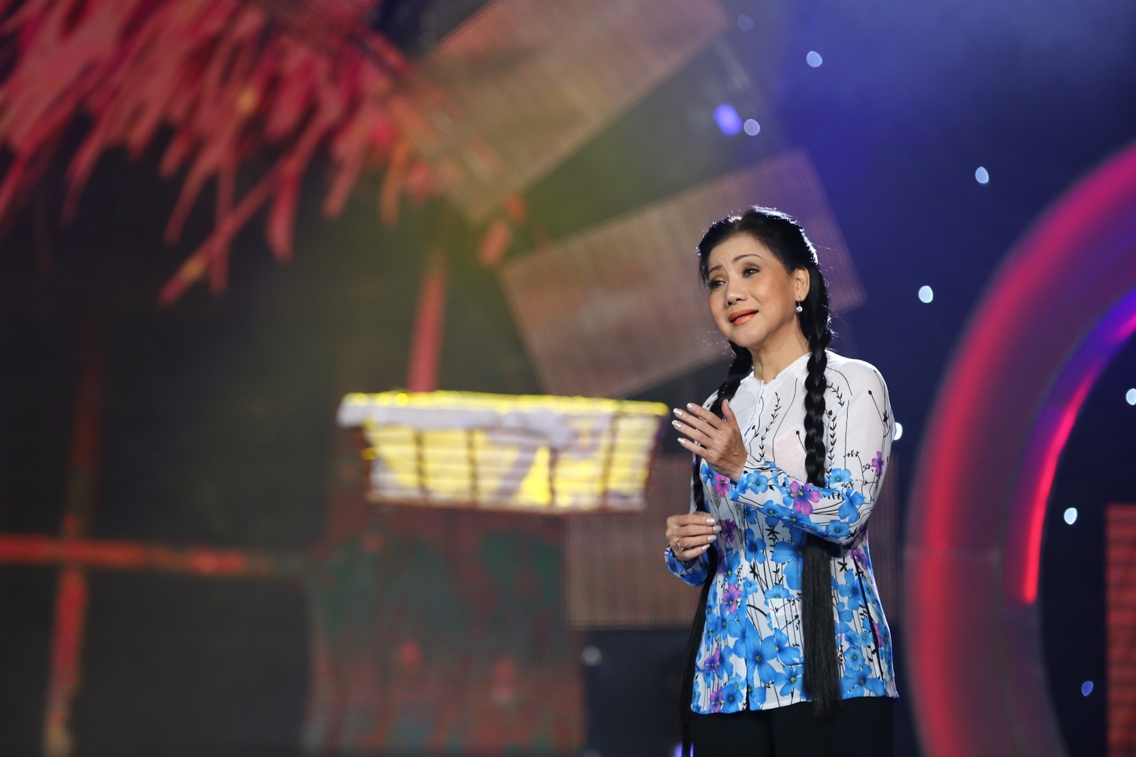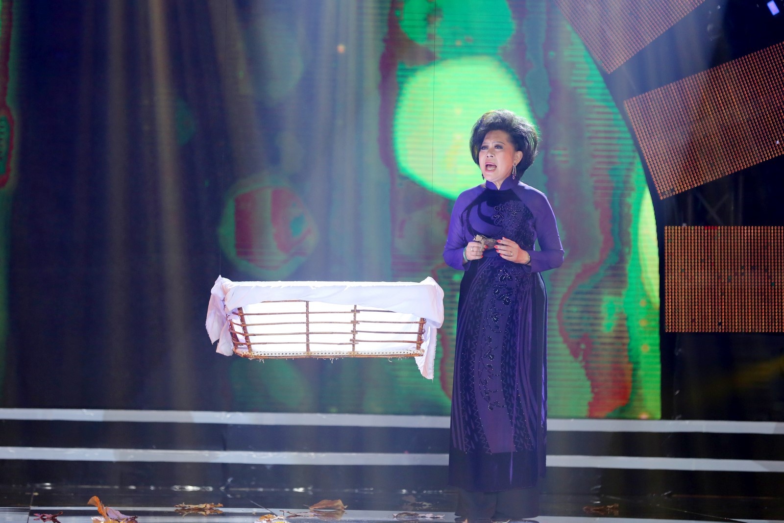 Sự mộc mạc trong giọng hát và lối diễn xuất sinh động của cải lương giúp tiết mục lôi cuốn người xem. Tú Sương đưa khán giả vào cảm xúc chân thật nhất của tình mẫu tử. |