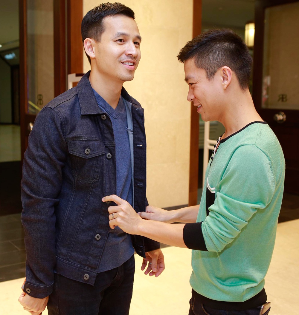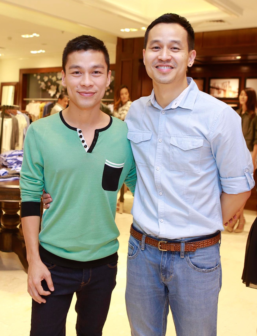| Tối 23/4, NTK Adrian Anh Tuấn và Sơn Đoàn tham dự sự kiện khai trương nhãn thời trang tại TP HCM. Hai người diện trang phục giản dị, tươi tắn trước ống kính. Sau lễ cưới đồng tính hồi tháng 1, cặp đôi nhận được nhiều sự quan tâm của giới truyền thông. |