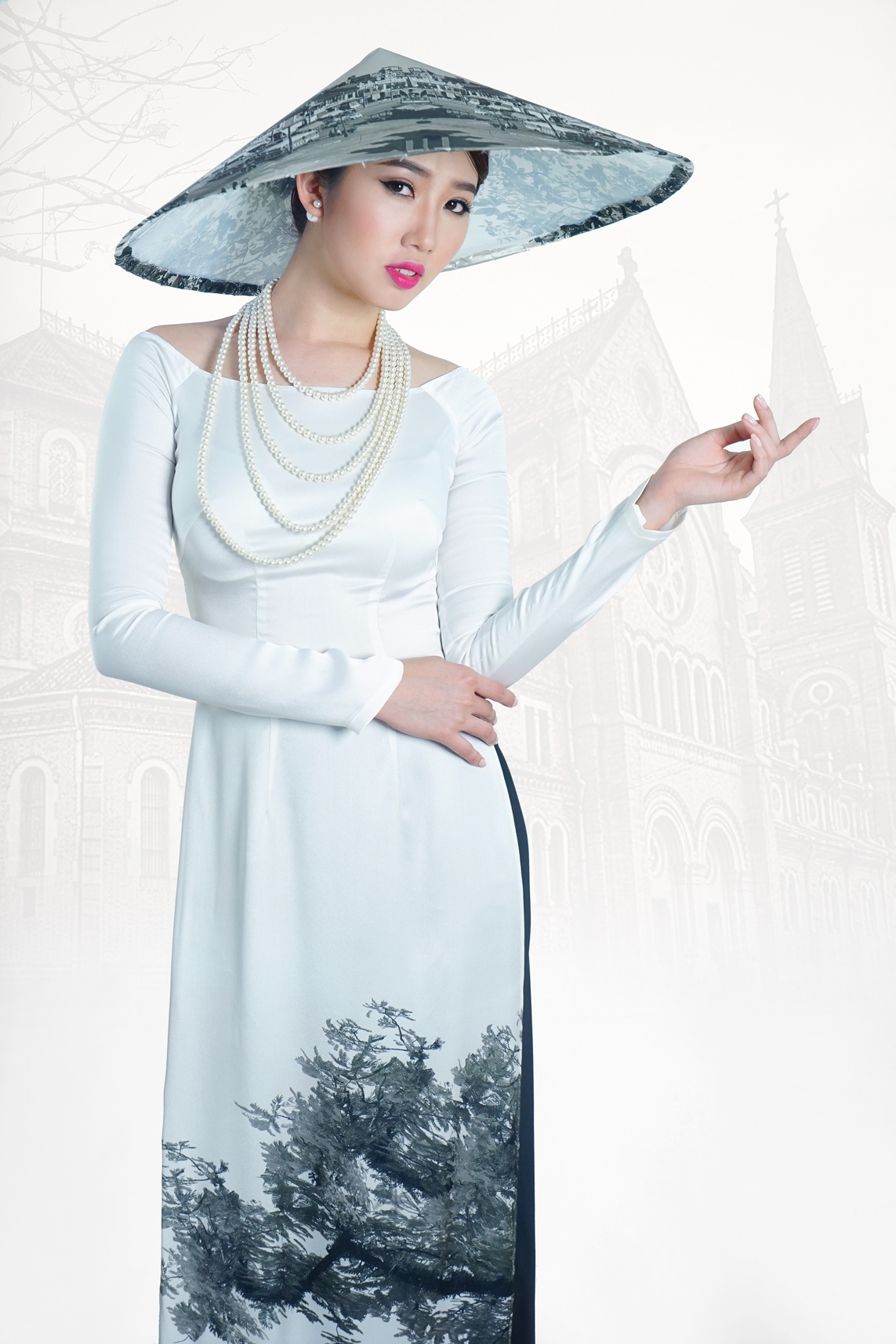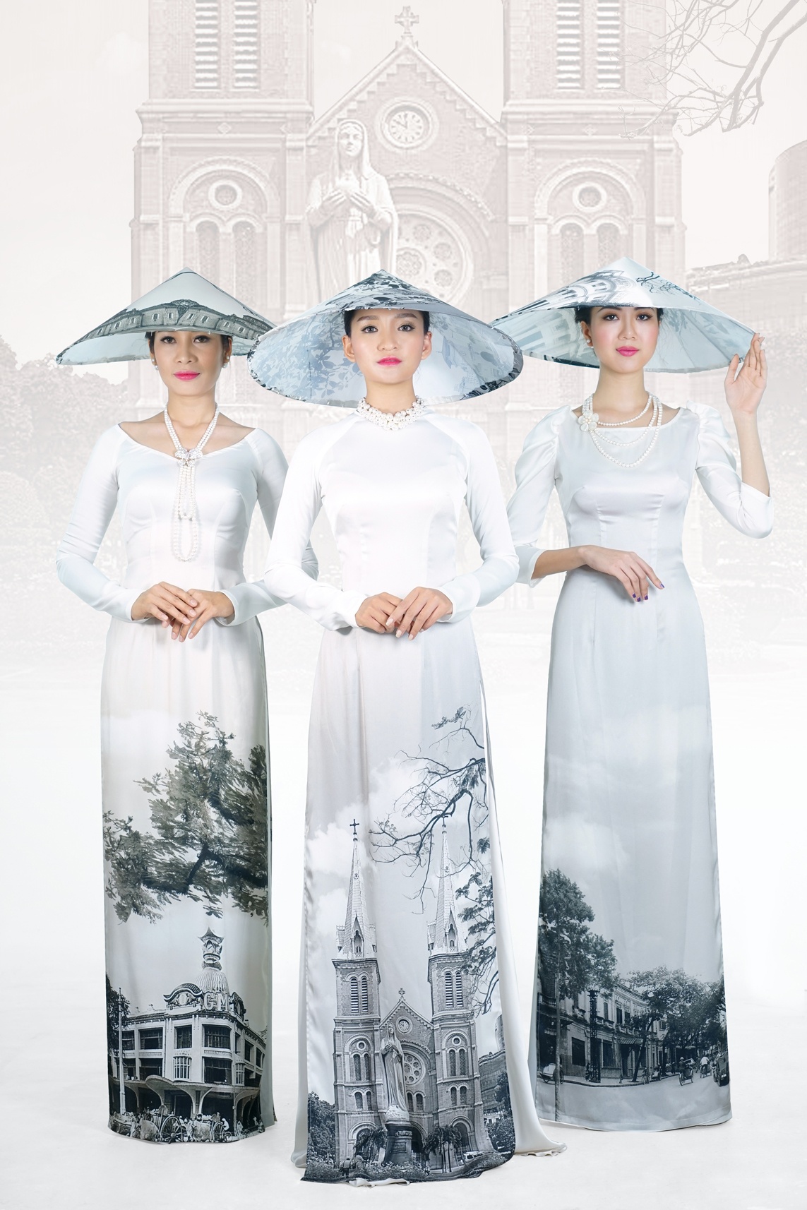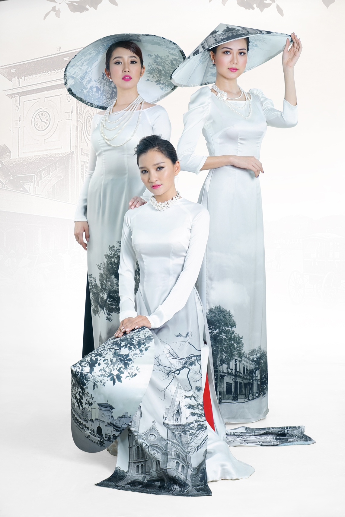 | Bối cảnh cổ điển được in khéo léo trên thân áo, tà áo giúp nhà thiết kế lưu giữ những ký ức đẹp về Sài Gòn trong quá khứ. |