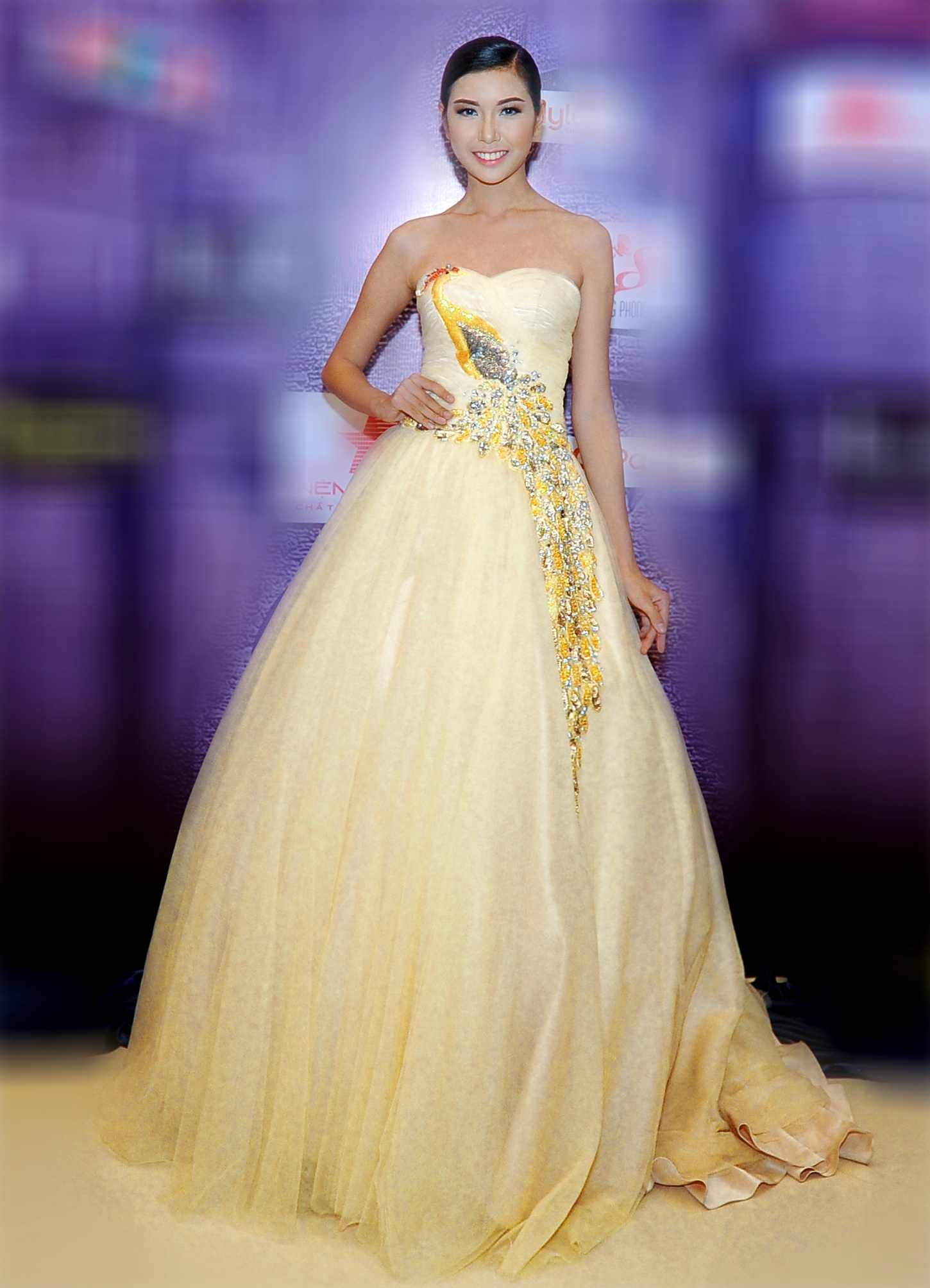 | Vẻ đẹp của Hoa hậu Hoàn vũ 2015 Phạm Hương được tôn vinh qua bộ trang phục dạ hội sang trọng của NTK Ngọc Long. |