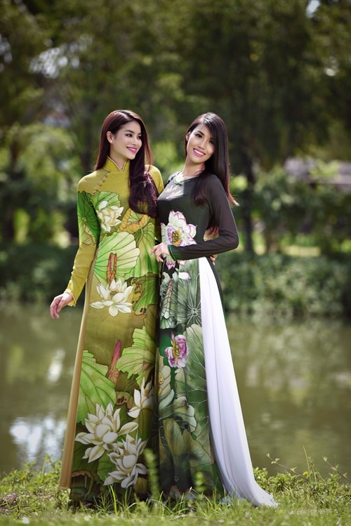 | Người mẫu Phạm Hương và Lan Khuê thể hiện hai mẫu áo dài thuộc bộ sưu tập Quốc hoa. Ảnh: Quốc Huy |