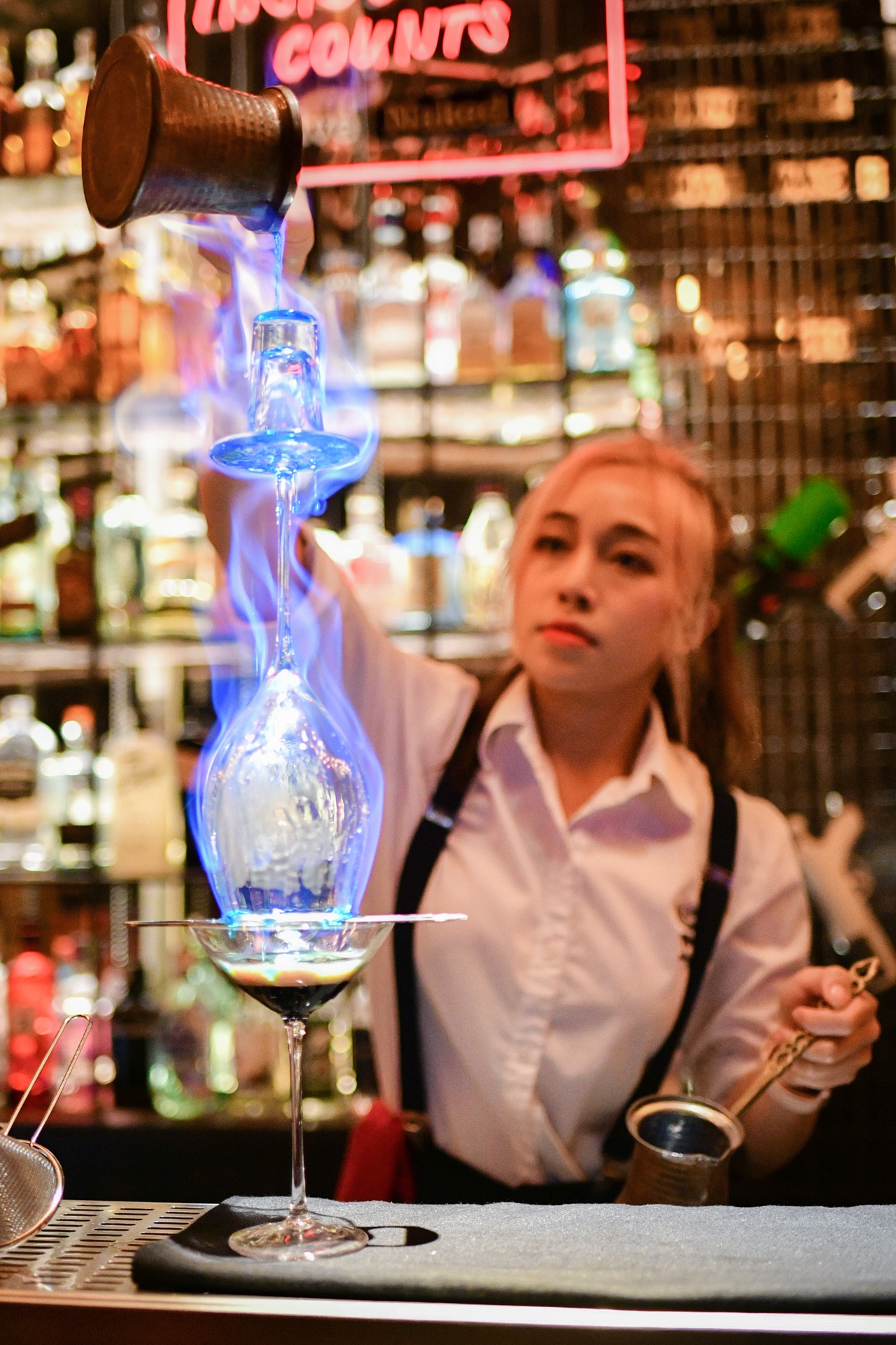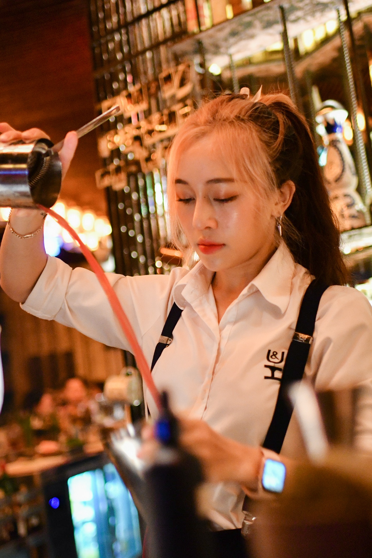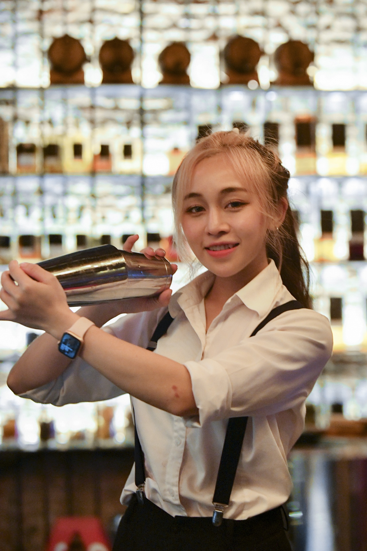 | Tôi khá chú trọng vào kỹ thuật biểu diễn với shaker. Theo tôi, một ly cocktail ngon được kết hợp giữa sự tinh tế khi pha rượu và lực lắc phù hợp. Tôi đang tập động tác hứng chai rượu từ trên cao vào bình lắc. Các kỹ thuật khó như vậy phải mất 6 tháng mới nhuần nhuyễn. |