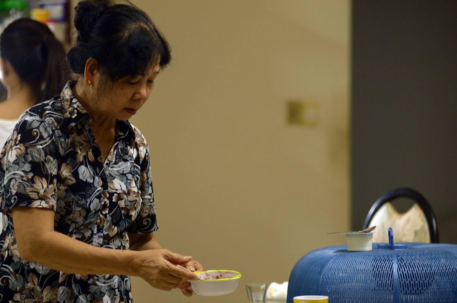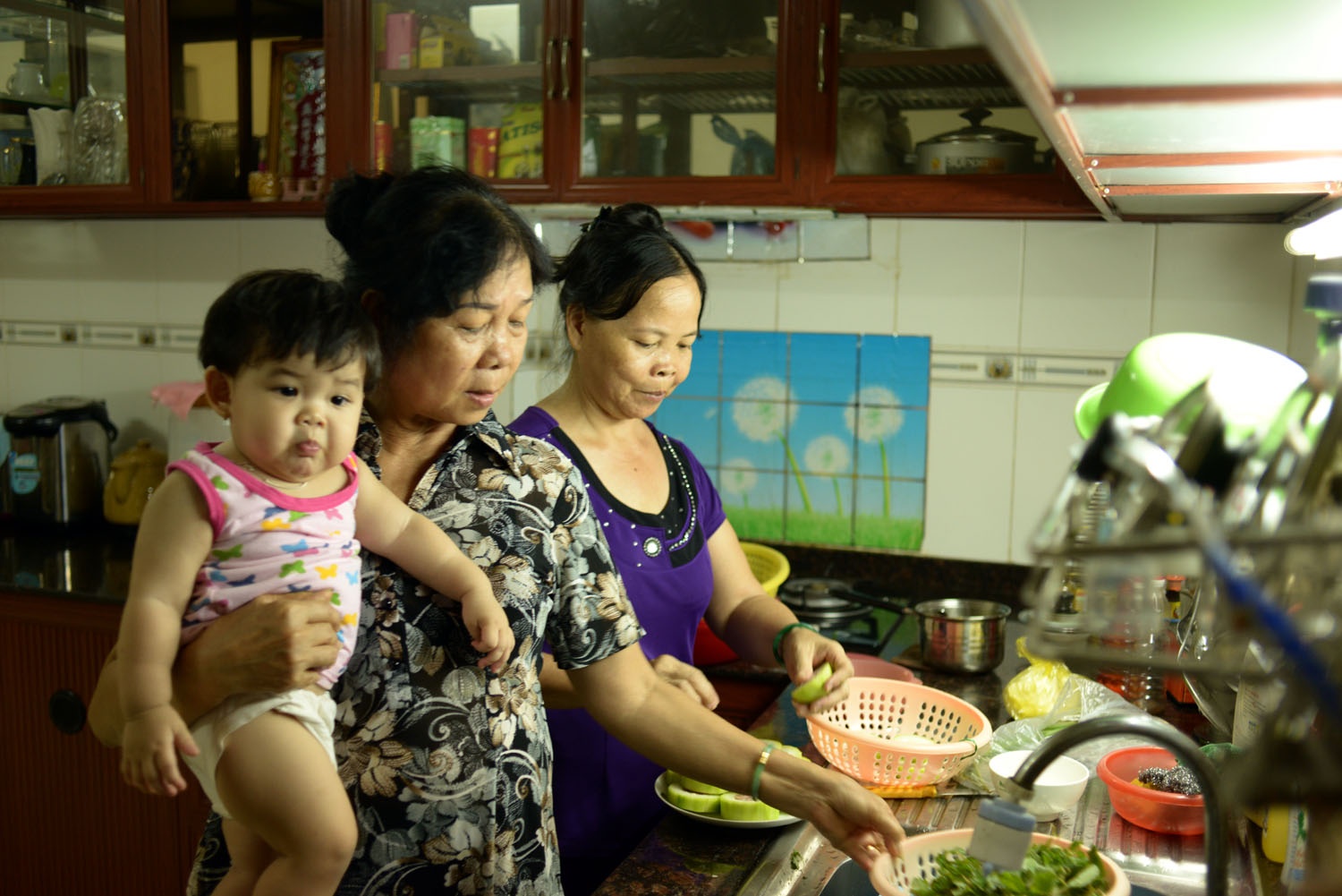 | Bà thường cùng con gái, con dâu vào bếp chuẩn bị bữa ăn chiều, thời khắc ấm cúng là bữa cơm chiều đông đủ con cháu, dâu, rể. |