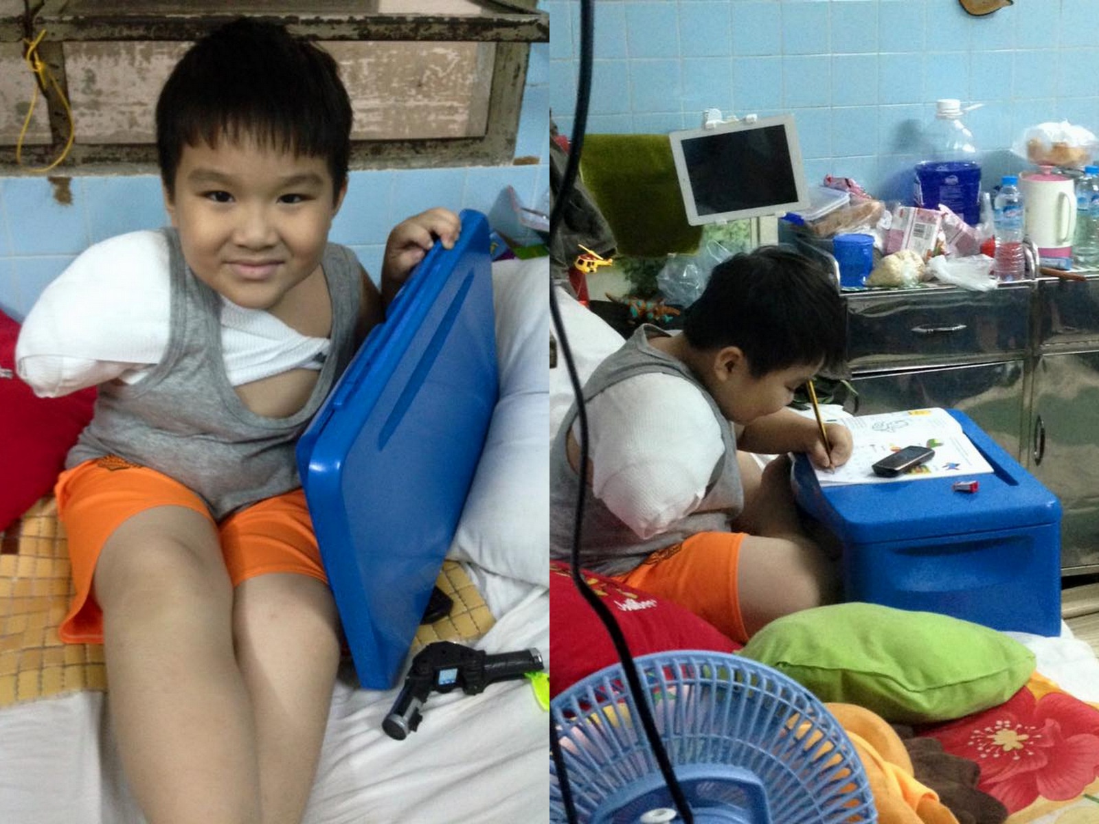 | Hoàng Long tỏ ra lạc quan, mạnh mẽ chiến đấu với vết thương. Cậu chủ động viết bài, tự tập ăn bằng tay trái. Việc học ở trường của Long cũng bị gián đoạn. Ảnh: Đồng Nam Anh. |