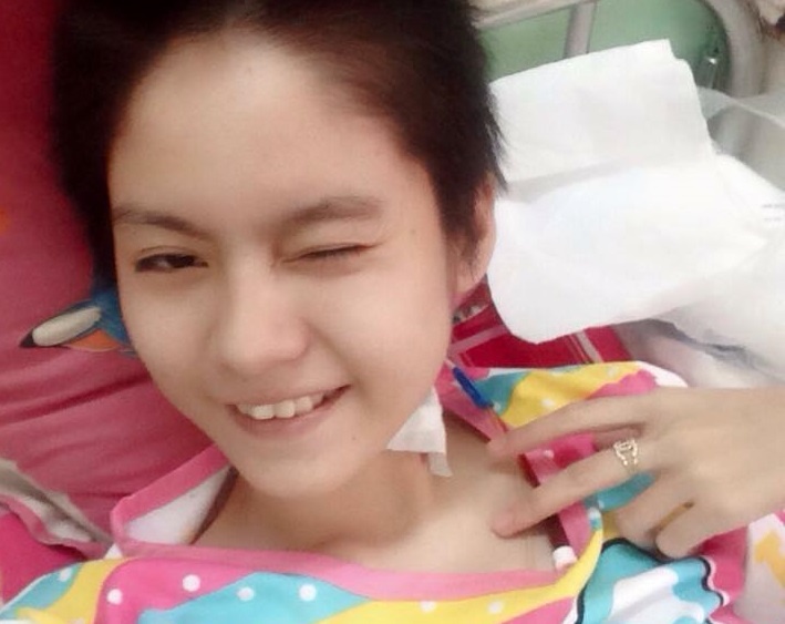 | Huỳnh Hương nở nụ cười lạc quan trên giường bệnh. Ảnh: Hoàng Yến. |