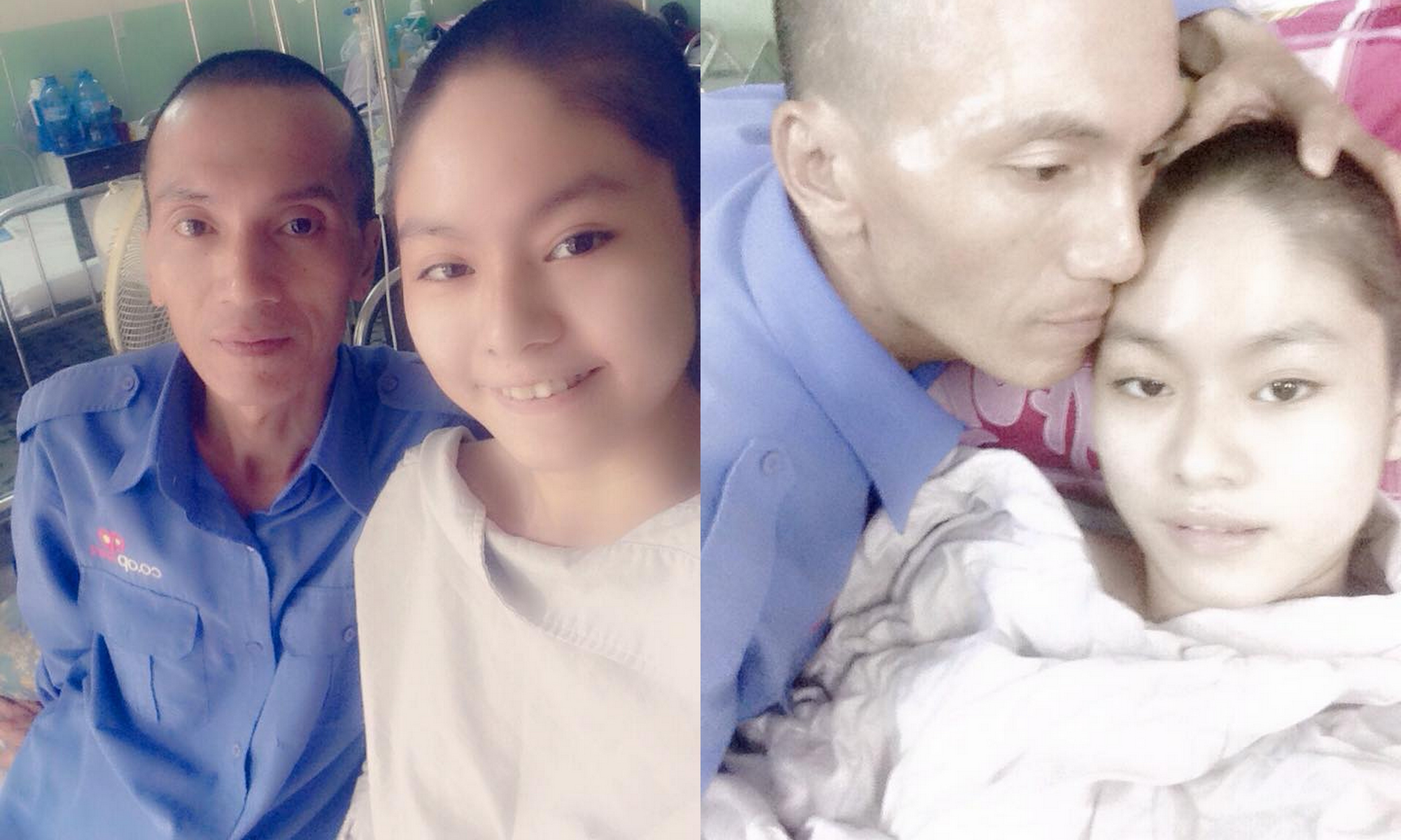 | Huỳnh Hương bên cạnh bố của cô. Nữ DJ 9X vẫn lạc quan và hy vọng trước bệnh tật của bản thân.Ảnh: Hoàng Yến. |