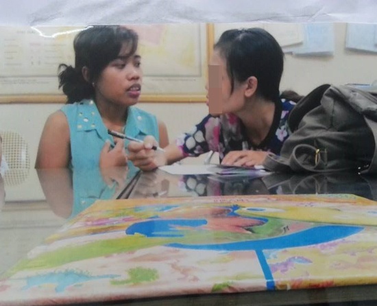 | Triwening Puji Astuti (áo xanh) tại cơ quan công an. |