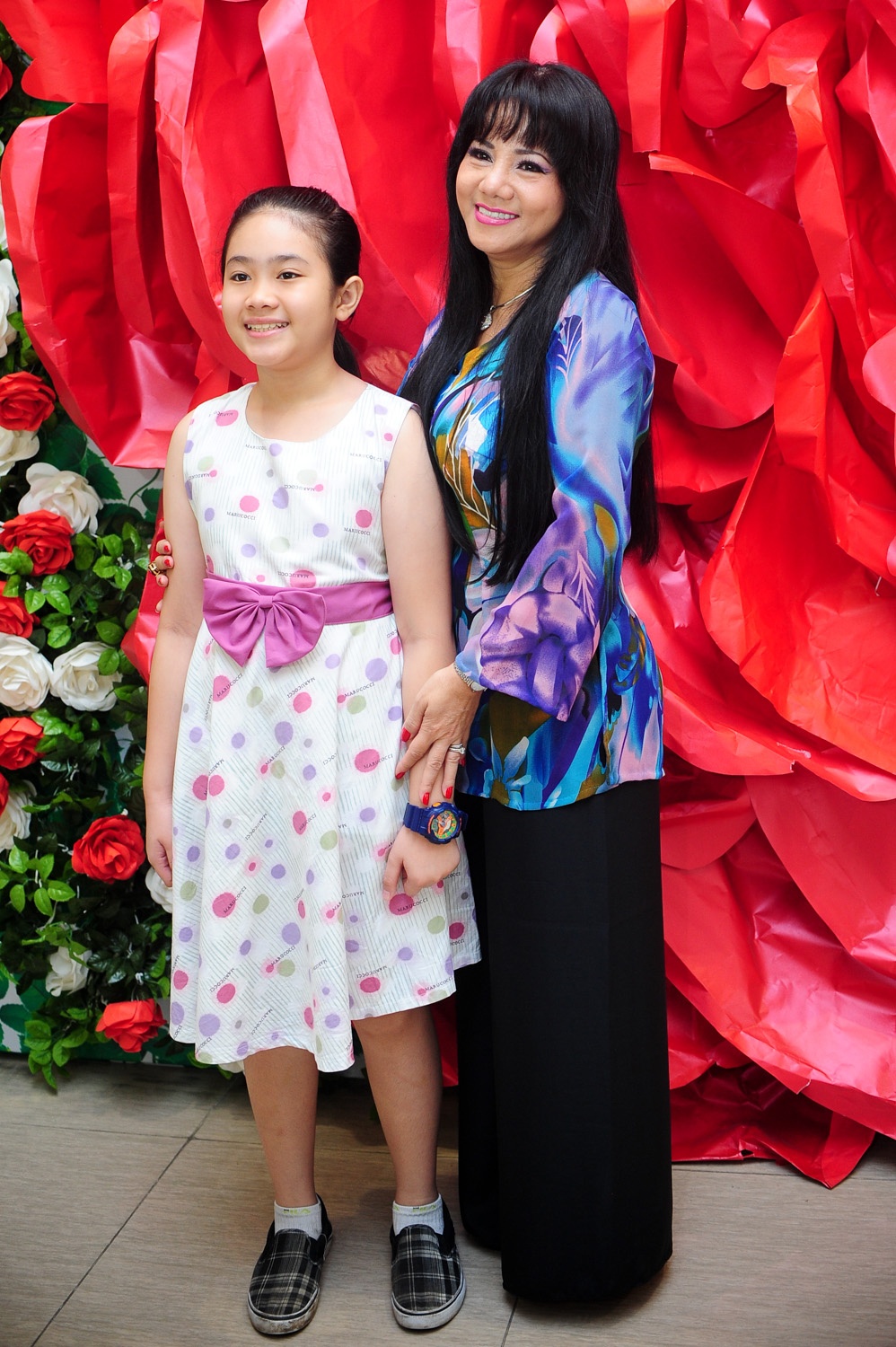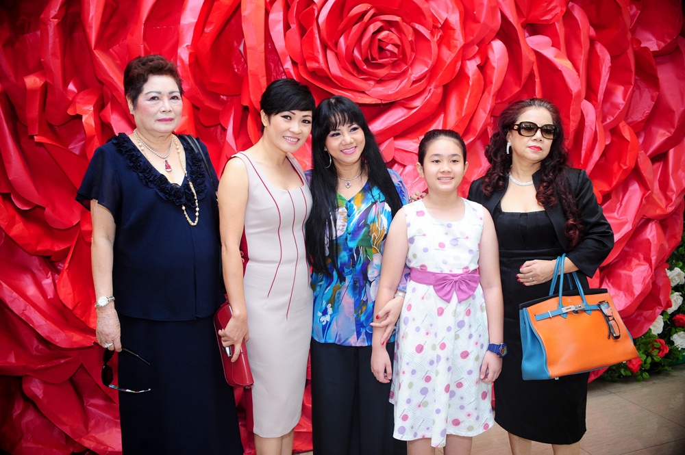 | Ngọc Ánh và con gái chụp cùng các đồng nghiệp như ca sĩ Phương Thanh, bà Bích Phương - mẹ Kasim Hoàng Vũ và bà Kim Loan - mẹ ca sĩ Ngọc Sơn. Họ rất vui mừng khi lâu ngày mới hội ngộ. |