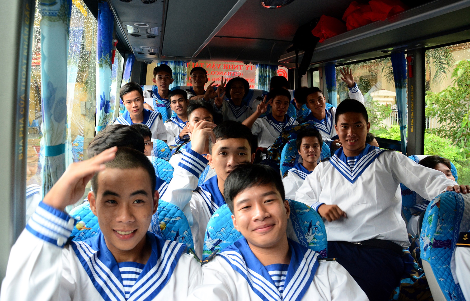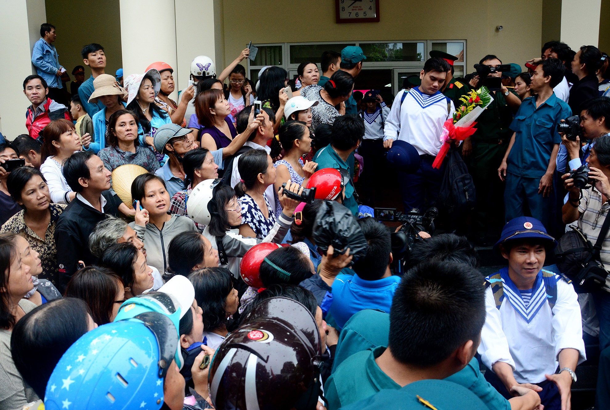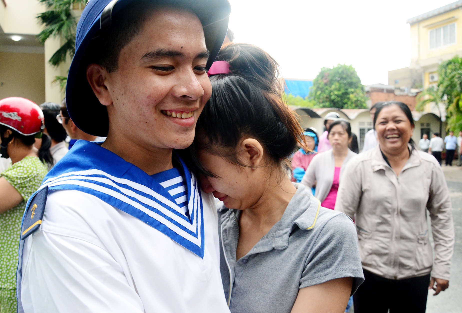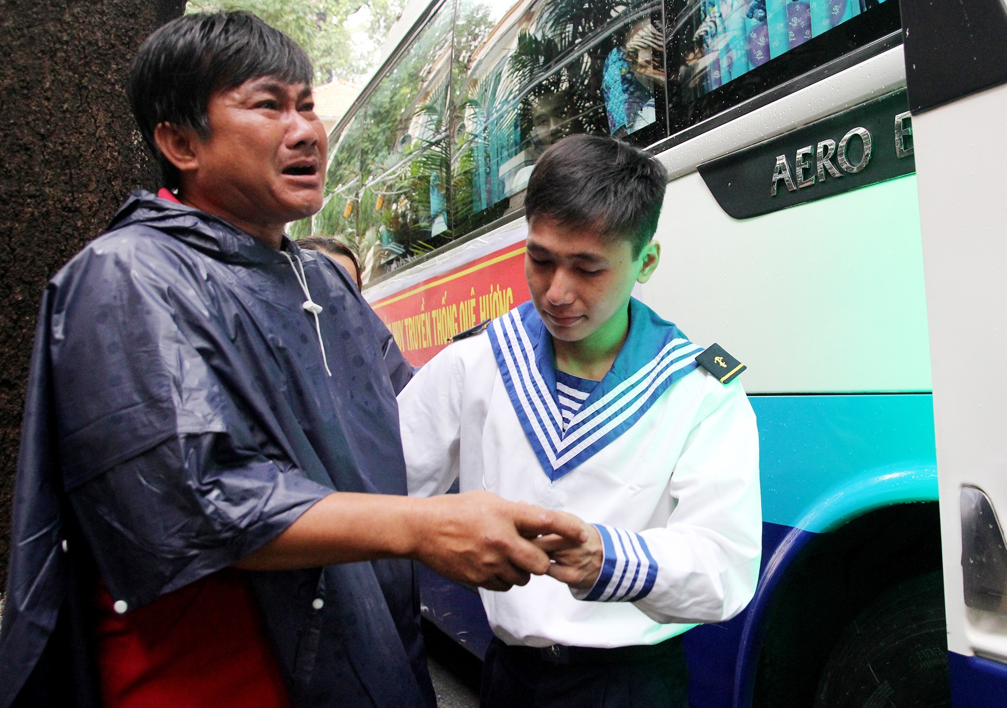 Anh Nguyễn Quốc Dũng (quận Bình Thạnh) bật khóc khi chia tay con trai Nguyễn Quốc Tiến (23 tuổi). Anh Dũng cho hay, cậu lớn trong nhà vừa tốt nghiệp đại học, cháu chưa đi làm mà viết đơn tình nguyện xin nhập ngũ vào Lữ đoàn Hải quân 957 để rèn luyện bản thân và phục vụ Tổ quốc. "Mặc dù đi làm nhiệm vụ xa nhưng cả nhà rất ủng hộ và mong cháu sẽ trưởng thành hơn nữa trong môi trường mới", anh Dũng chia sẻ.