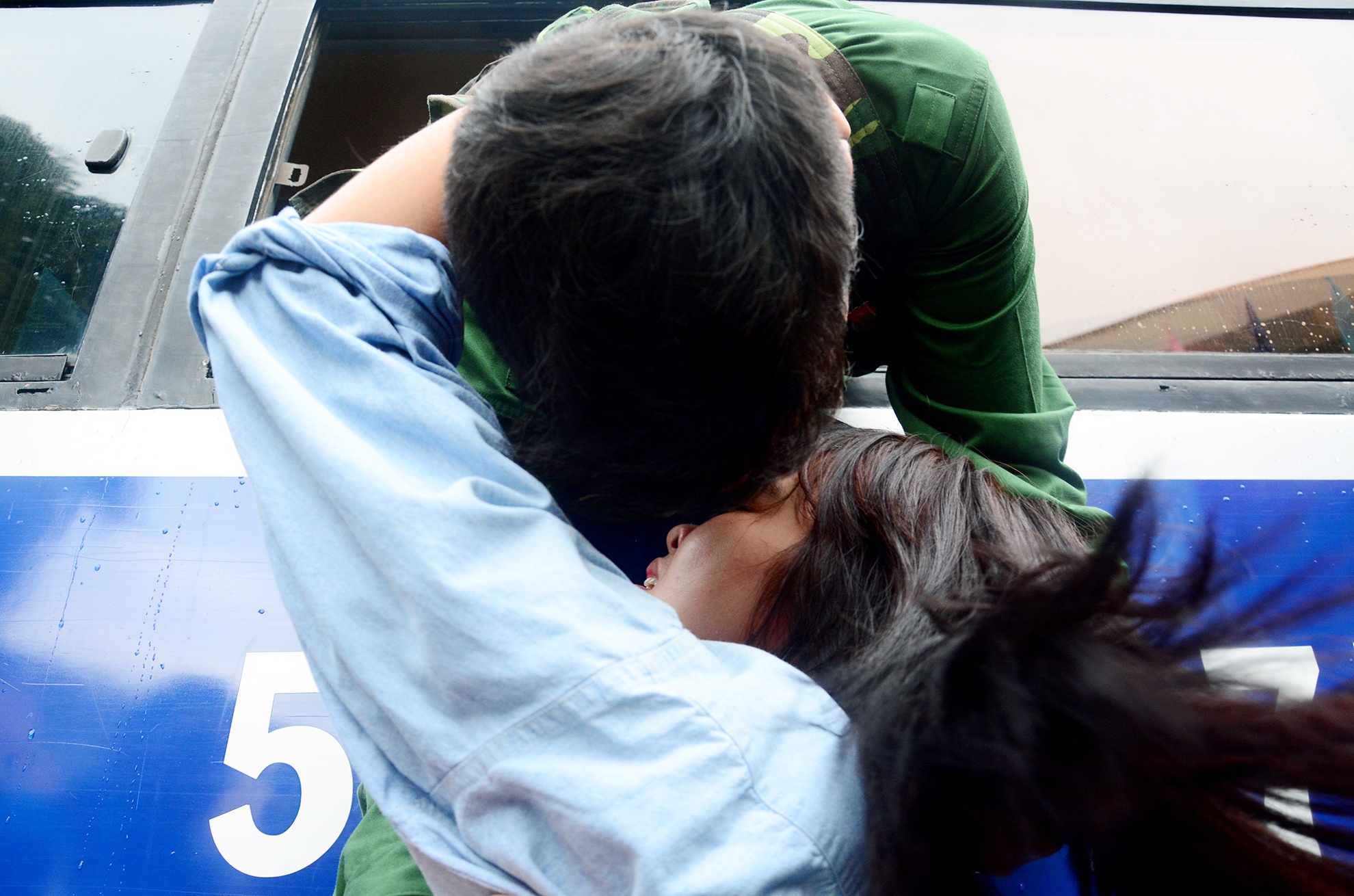 Tuyền, bạn gái của chiến sỹ Nguyễn Minh Chiến (quận Bình Thạnh) nắm tay người yêu thật lâu trong giây phút chuẩn bị lên đường.