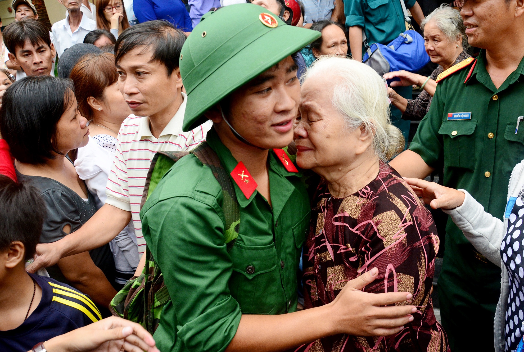 Bà Sáu (quận Phú Nhuận) không cầm được nước mắt khi ôm cháu nội. Bà cho biết, đang nằm trong bệnh viện, biết tin cháu lên đường nhập ngũ sáng nay đã trốn ra ngoài đi để tiễn cháu. "Phải xa đứa cháu bé bỏng, lâu nay được gia đình bao bọc, tôi chỉ lo ở môi trường mới nó chưa biết tự chăm sóc cho bản thân", bà Sáu lo lắng.