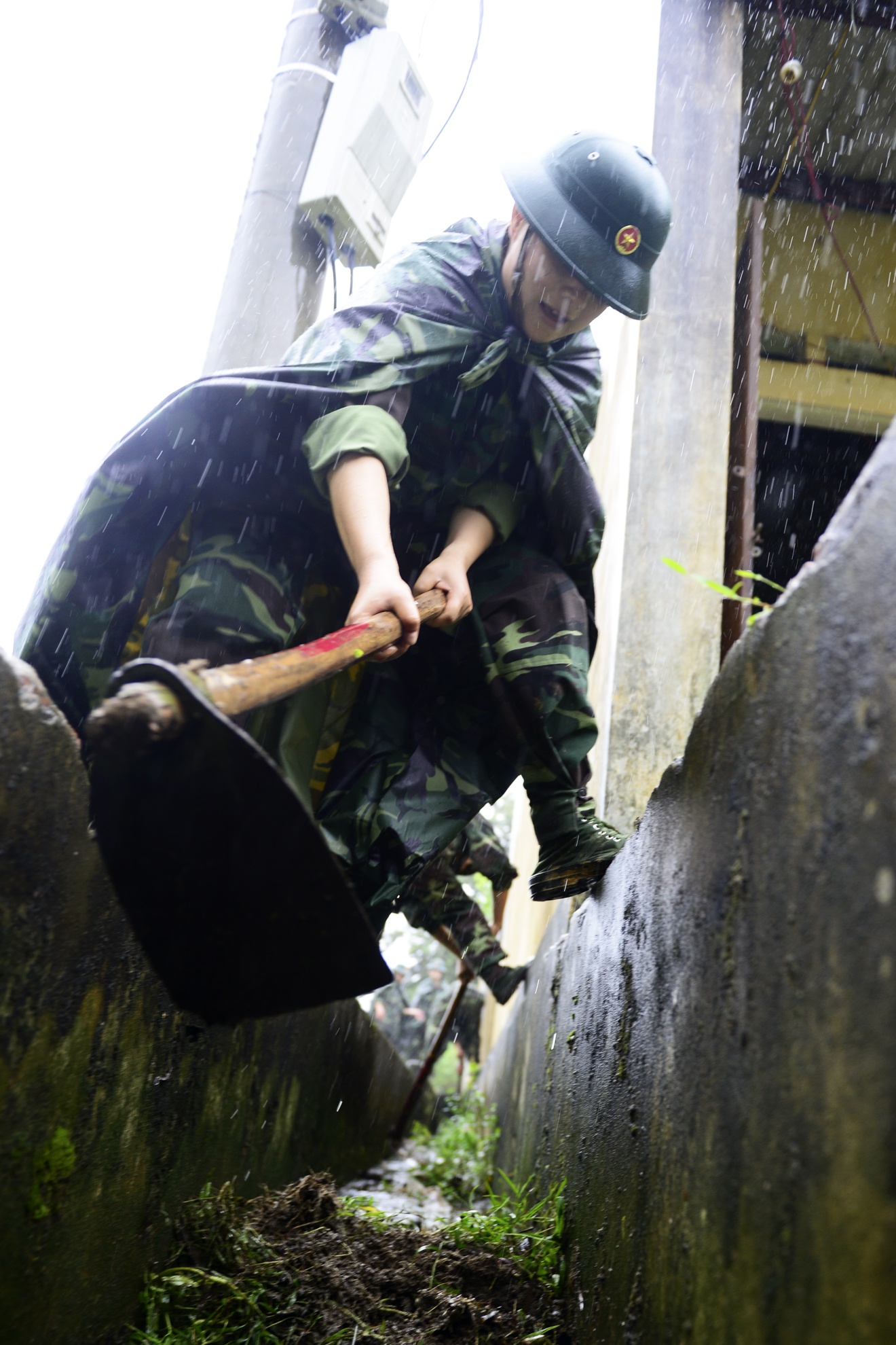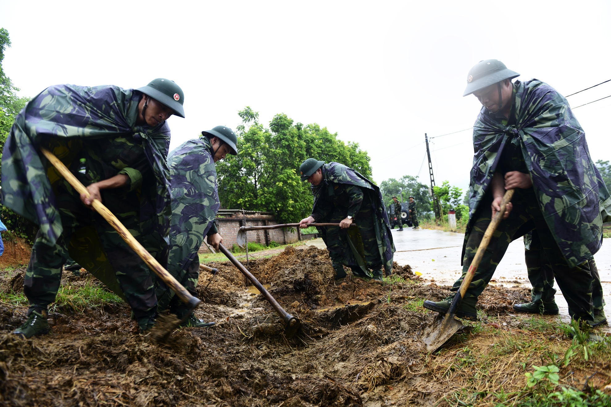 | Họ hành quân dưới mưa gần 5 km từ doanh trại để đến địa phương làm công tác dân vận. |
