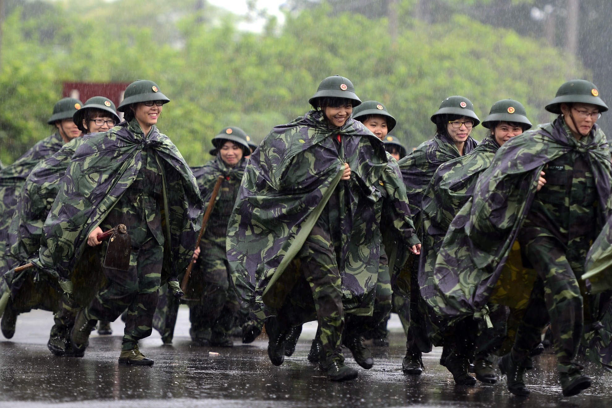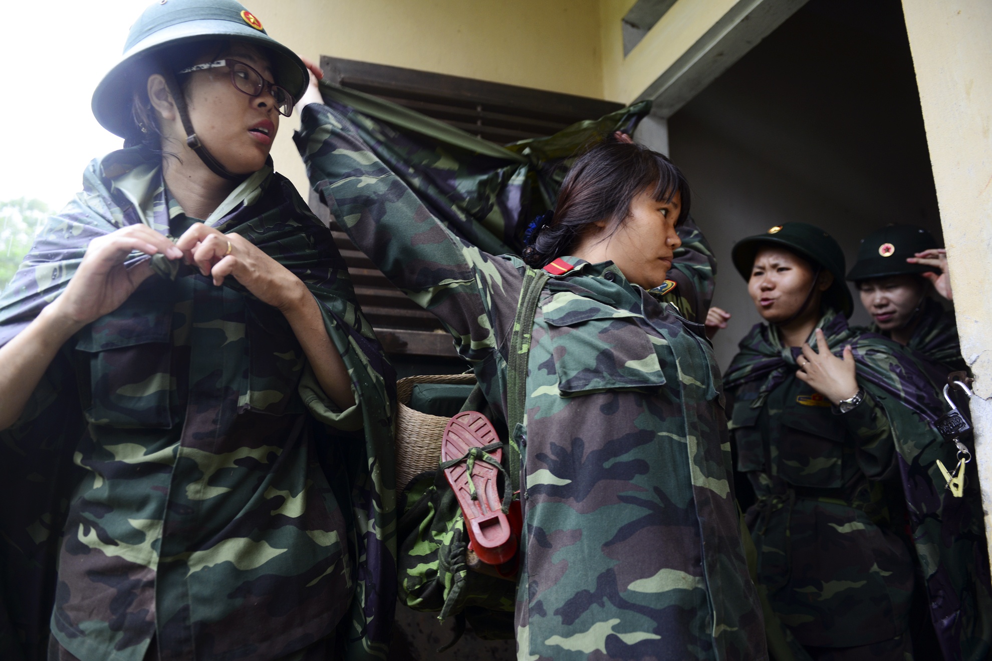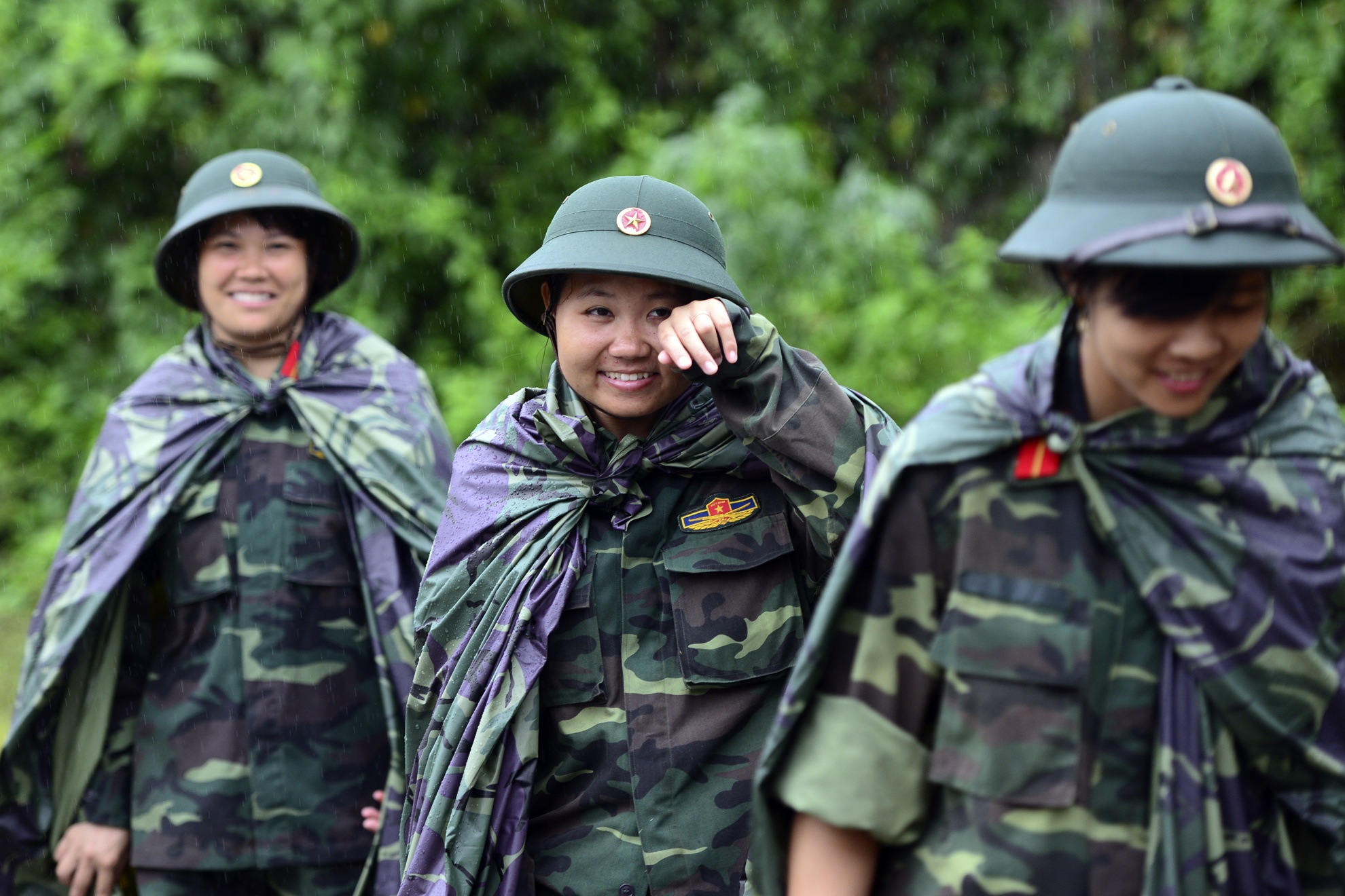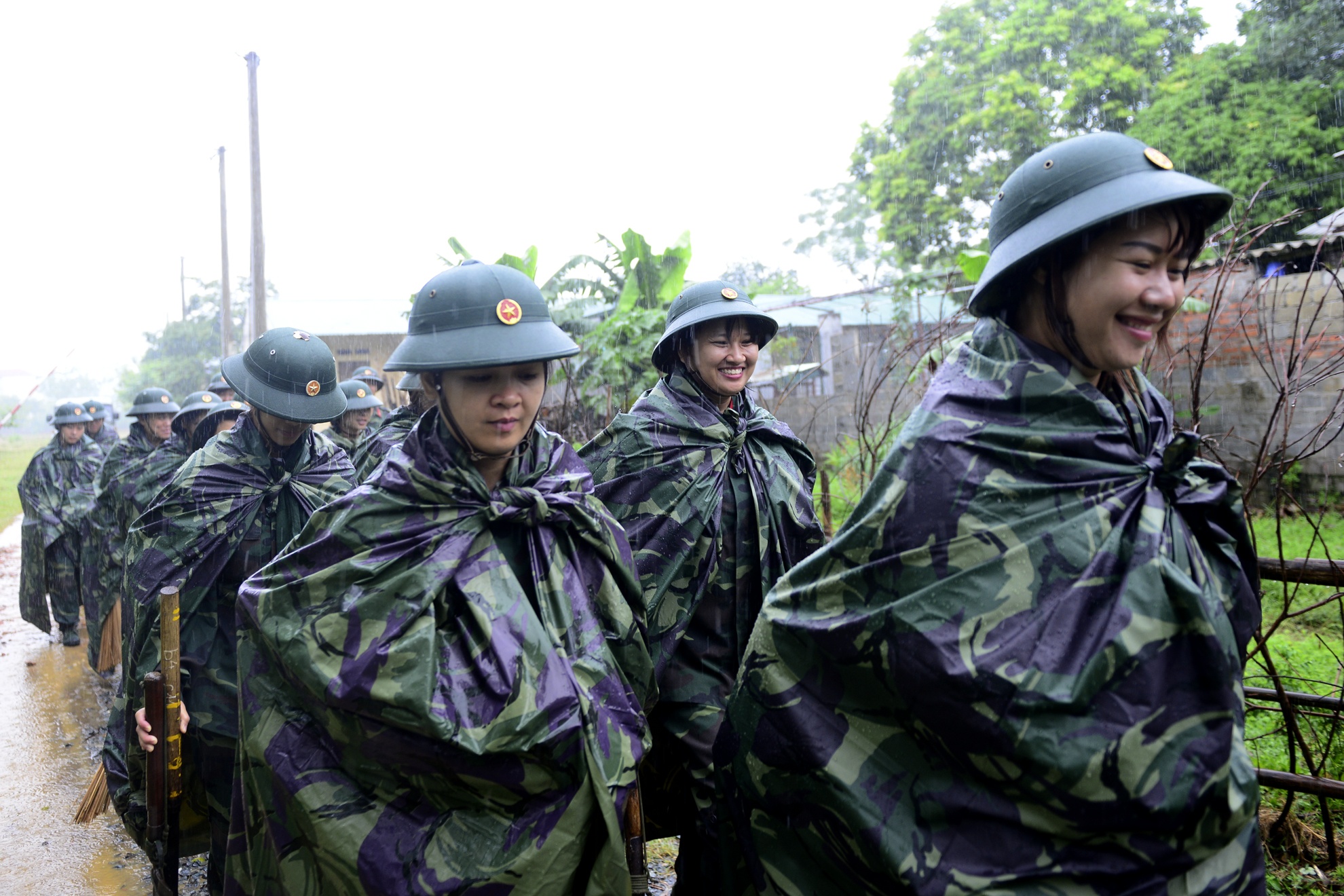 | Cơn mưa bất ngờ vào sáng sớm không khiến công tác huấn luyện bị hoãn lại. Tuy nhiên, với áo mưa và mũ bộ đôi, các nữ chiến sĩ vẫn sẵn sàng lên đường.