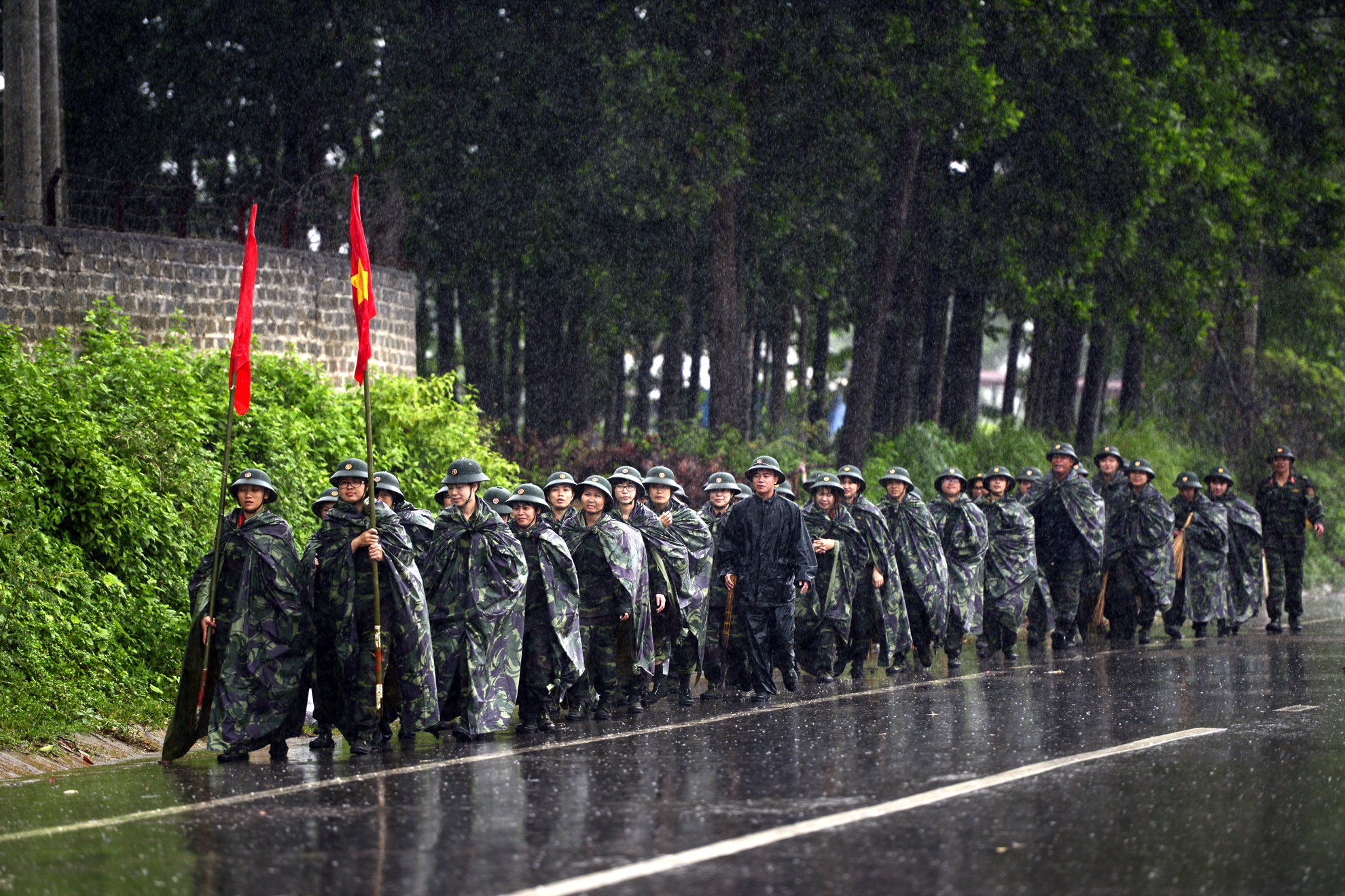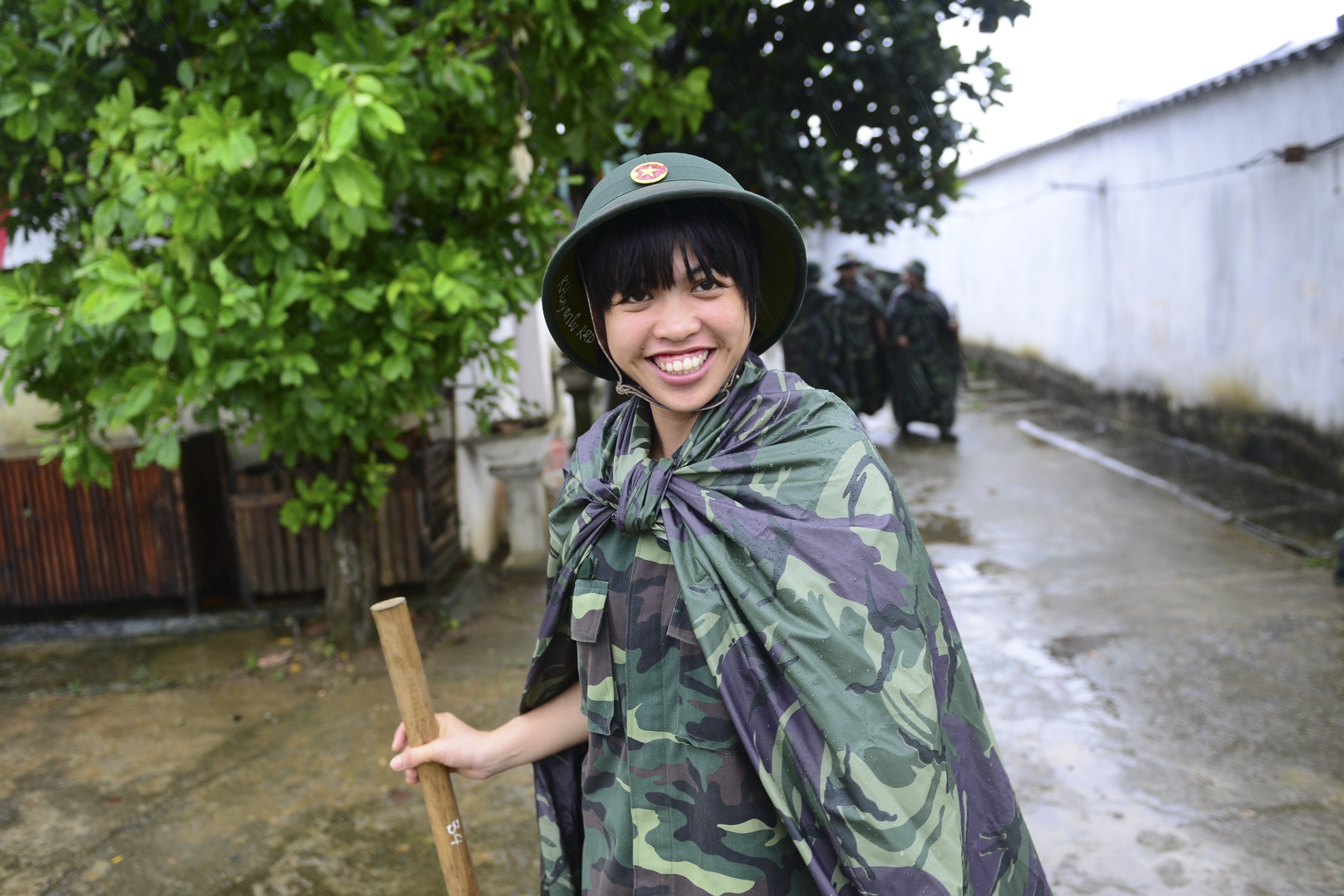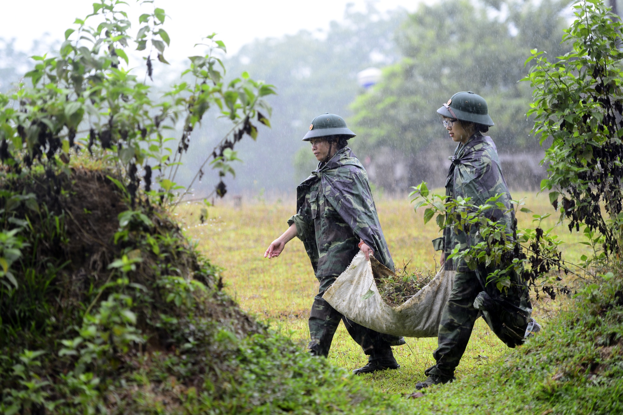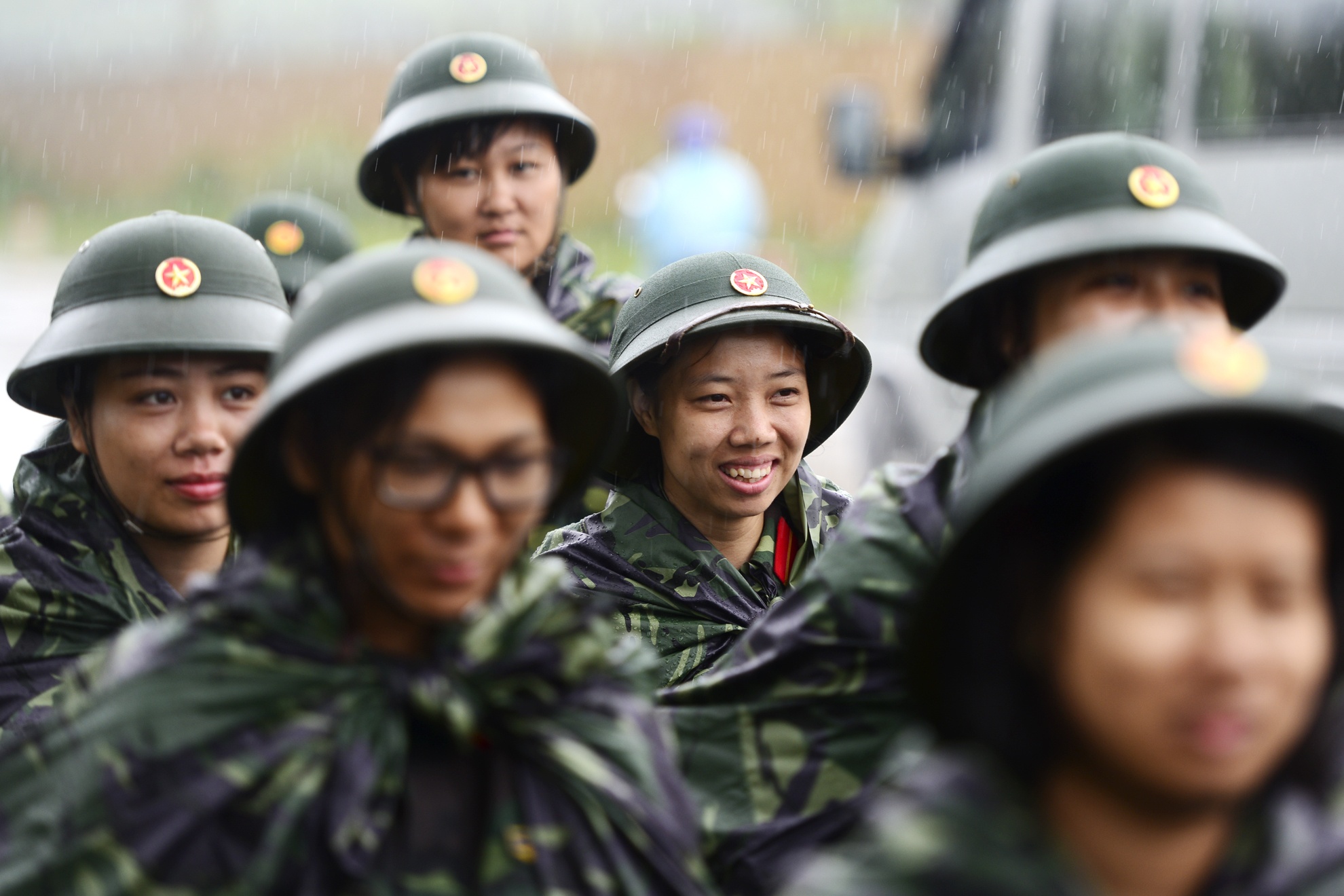 | Cơn mưa bất ngờ vào sáng sớm không khiến công tác huấn luyện bị hoãn lại. Tuy nhiên, với áo mưa và mũ bộ đôi, các nữ chiến sĩ vẫn sẵn sàng lên đường.