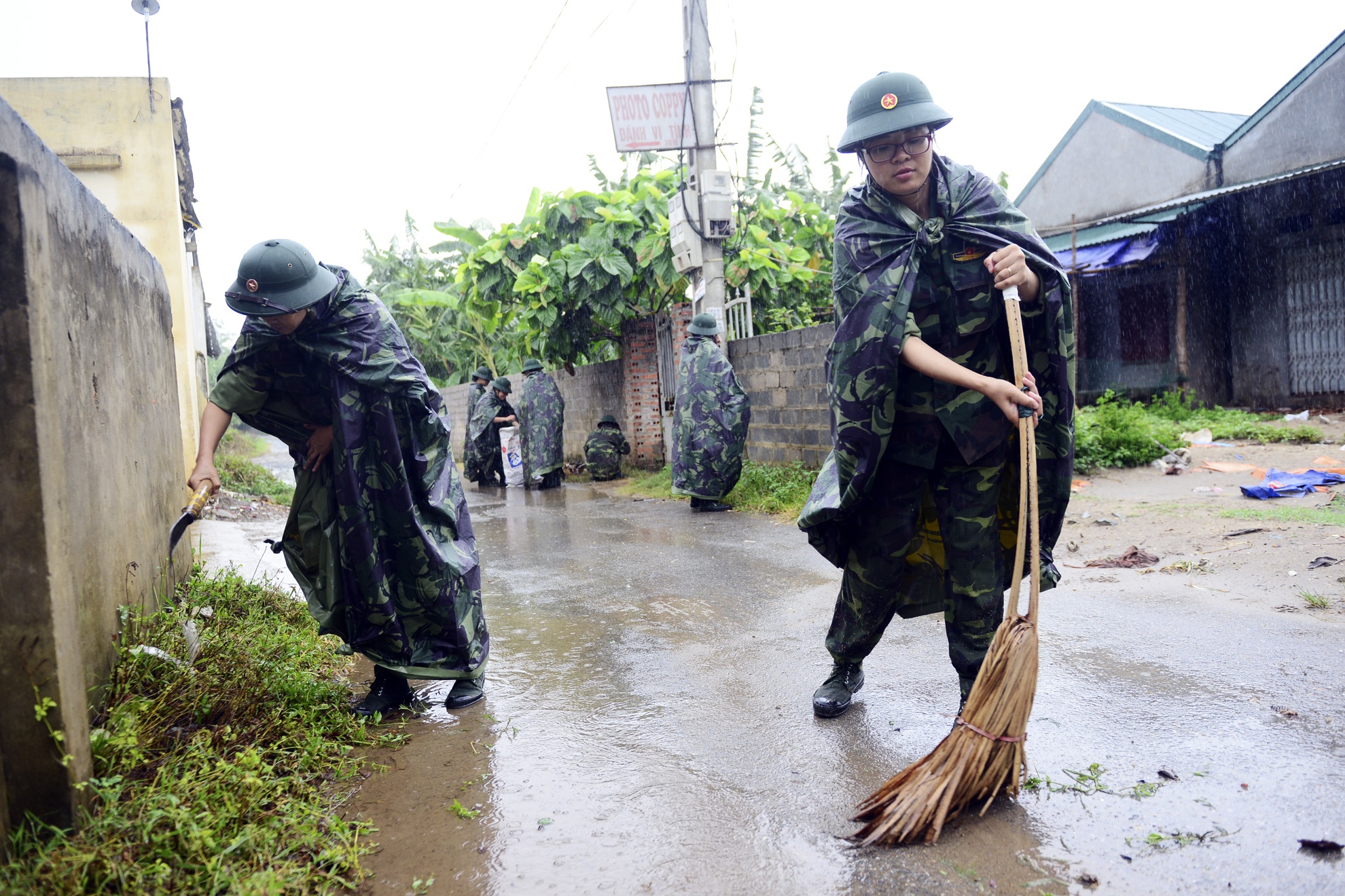 Nữ học viên 30 tuổi, Phạm Thị Hương Quỳnh (phải) cùng đồng đội dọn dẹp ngõ xóm tại thôn Yên Bình. Việc huấn luyện này sẽ rèn luyện sức khỏe, ý chí bản lĩnh người lính để đi xuyên qua khó khăn.