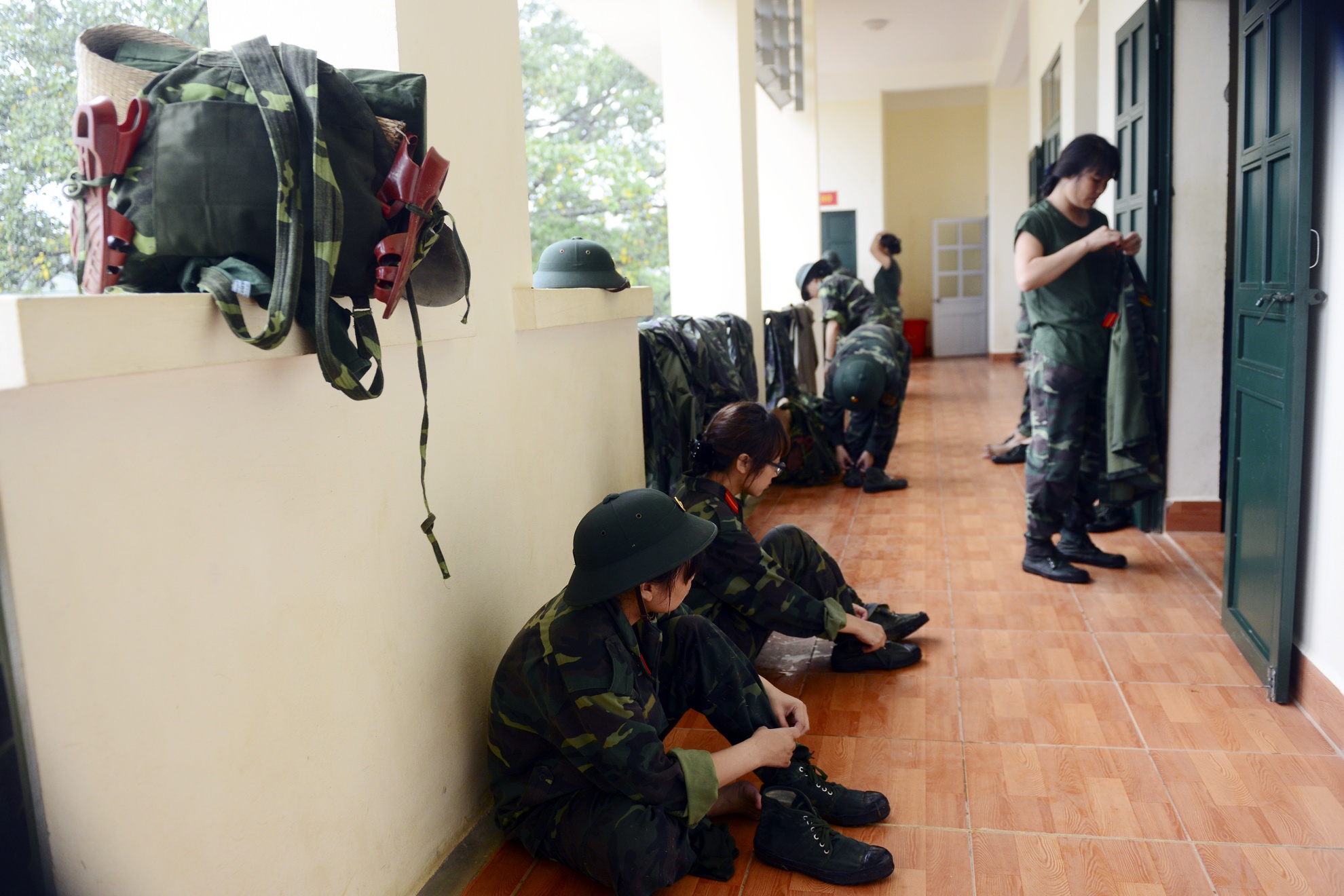 6h sáng tại Tiểu đoàn huấn luyện 4, Lữ đoàn 144 Bộ Tư lệnh thủ đô (Thạch Thất, Hà Nội), các nữ học viên quân sự tất bật chuẩn bị quân trang. Đây là một nội dung trong khóa huấn luyện quân sự kéo dài một tháng dành cho nhân viên công sở.
